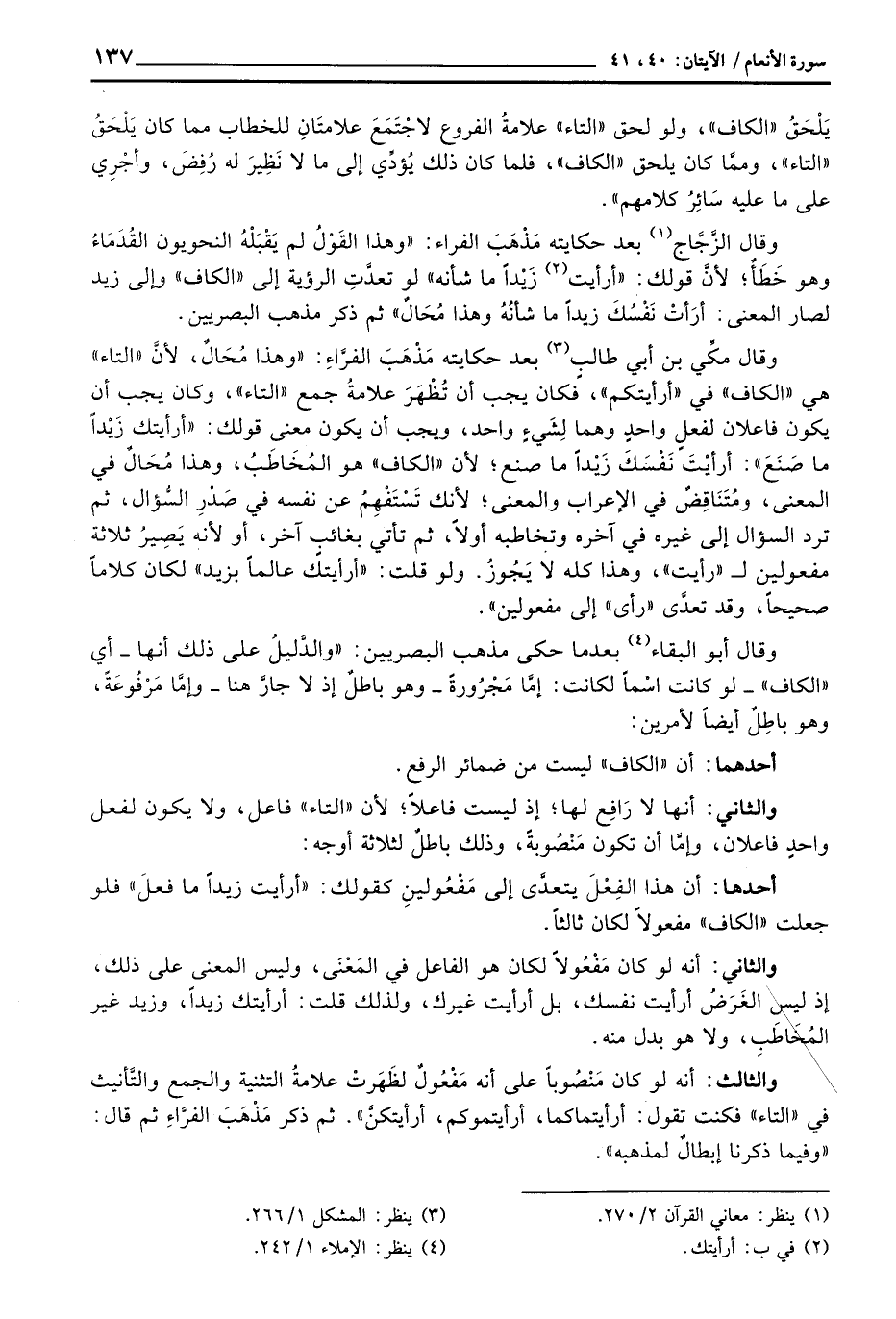 وقال الزَّجَّاج بعد حكايته مَذْهَبَ الفراء: «وهذا القَوْلُ لم يَقْبَلُهُ النحويون القُدَمَاءُ وهو خَطَأٌح لأنَّ قولك:» أرأيت زَيْداً ما شأنه «لو تعدَّتِ الرؤية إلى» الكاف «وإلى زيد لصار المعنى: أرَأتْ نَفْسُكَ زيداً ما شأنُهُ وهذا مُحَالٌ» ثم ذكر مذهب البصريين.