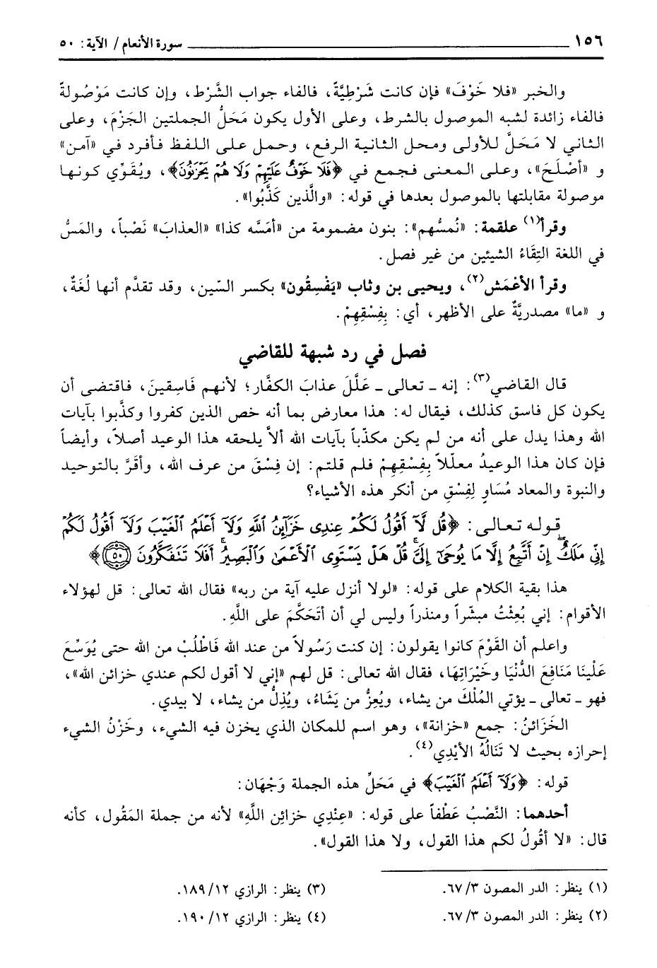 واعلم أن القَوْمَ كانوا يقولون: إن كنت رَسُولاً من عند الله فَاطْلُبْ من الله حتى يُوَسِّعَ عَلْينَا مَنَافِهَ الدُّنْيَا وخَيْرَاتِهَا، فقال الله تعالى: قل لهم «إني لا أقول لكم عندي خزائن الله» ، فهو - تعالى - يؤتي المُلْكَ من يشاء، ويُعِزُّ من يَشَاءُ، ويُذِلُّ من يشاء، لا بيدي.