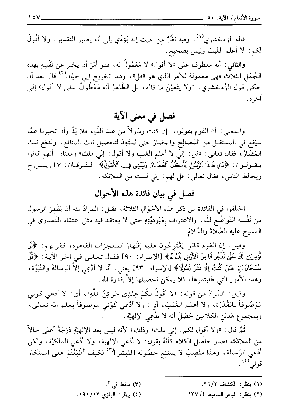 والثاني: أنه معطوف على» لا أقول «لامَعْمُولٌ، فهو أمَرَ أن يخبر عن نَفْسِهِ بهذه الجُمَلِ الثلاث فهي معمولة للأمر الذي هو» قل «، وهذا تخريج أبي حيَّان قال بعد أن حكى قول الزَّمخشري:» ولا يتَعيَّنُ ما قاله، بل الظَّاهرُ أنه مَعْطُوفٌ على لا أقول «إلى آخرة.