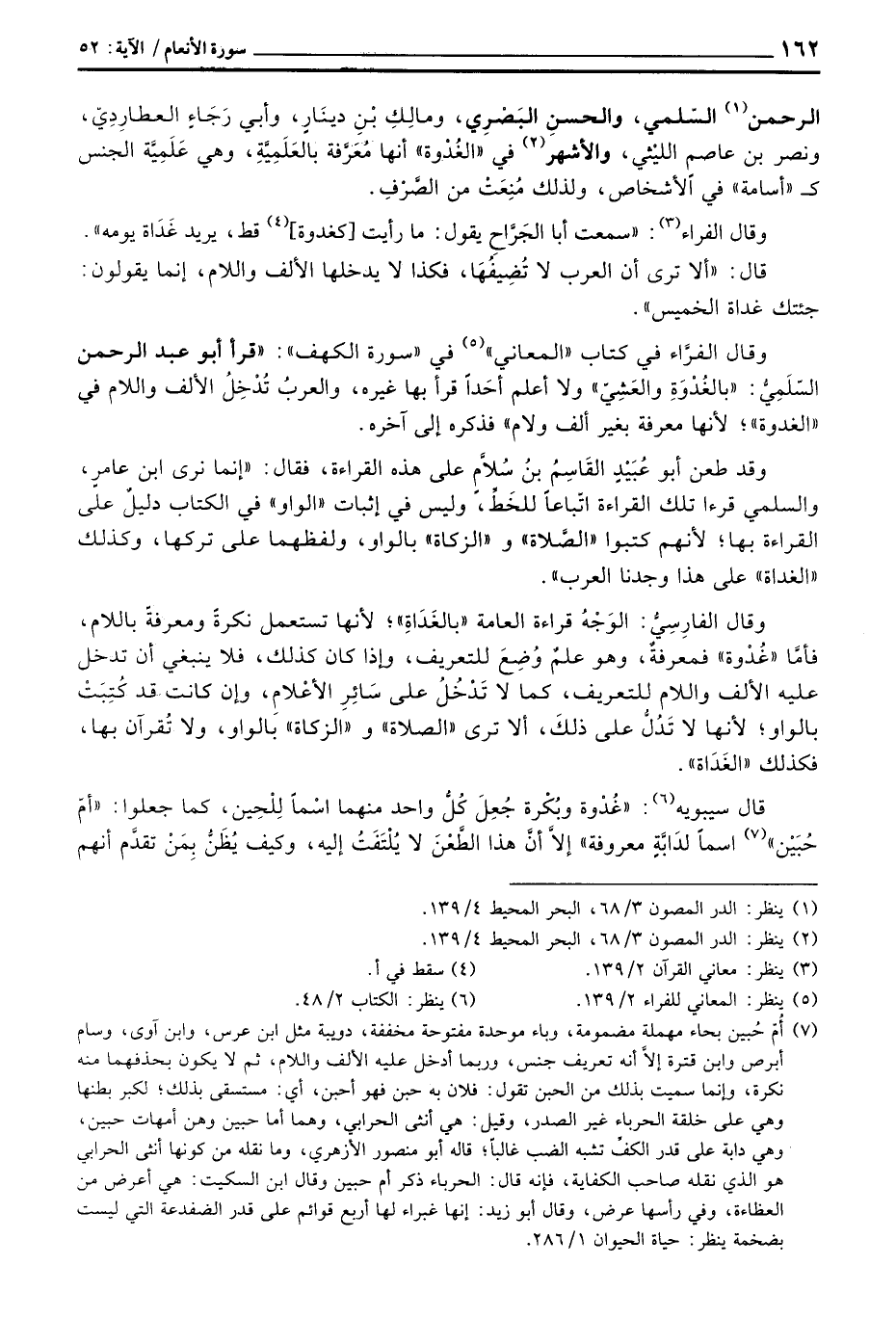وقال الفرَّاء في كتاب «المعاني» في «سورة الكهف» : قرأ أبو عبد الرحمن السّلَمِيُّ: «بالغُدْوَةِ والعَشِيّ» ولا أعلم أحَداً قرأ بها غيره، والعربُ تُدْخِلُ الألف واللام في «الغدوة» ؛ لأنها معرفة بغير ألف ولام «فذكره إلى آخره.
