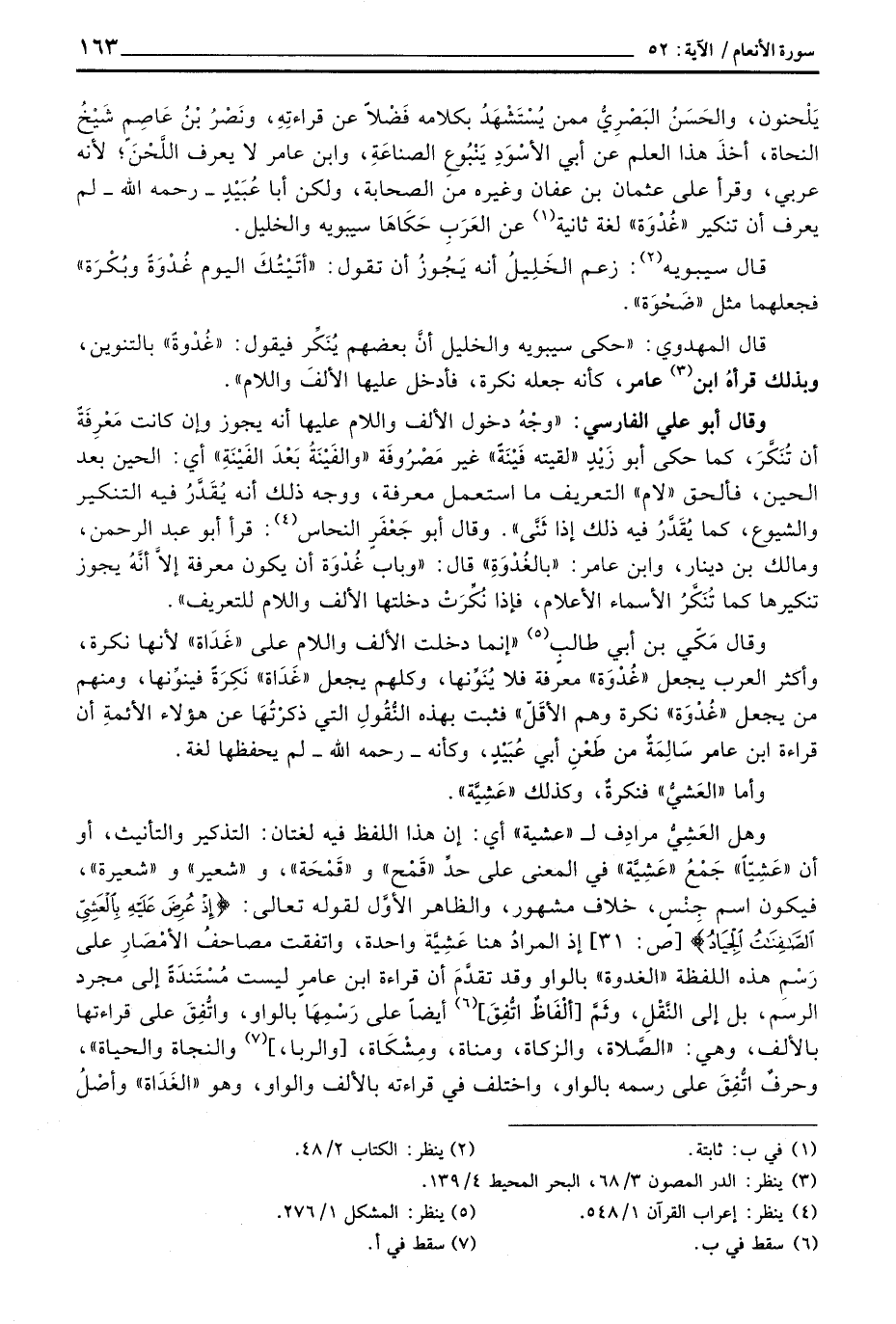 يَلْحنون، والحَسَنُ البَصْرِيُّ ممن يُسْتَشْهَدُ بكلامه فَضْلاً عن قراءتِهِ، ونَصْرُ بْنُ عَاصِم شَيْخُ النحاة، أخذَ هذا العلم عن أبي الأسْوَدِ يَنْبُوعِ الصناعِةِ، وابن عامر لا يعرف اللَّحْنَ؛ لأنه عربي، وقرأ على عثمان بن عفان وغيره من الصحابة، ولكن أبا عُبَيْدٍ - رَحِمَهُ اللَّهُ - لم يعرف أن تنكير «غُدْوَة» لغة ثانية عن العَرَبِ حَكَاهَا سيبويه والخليل.