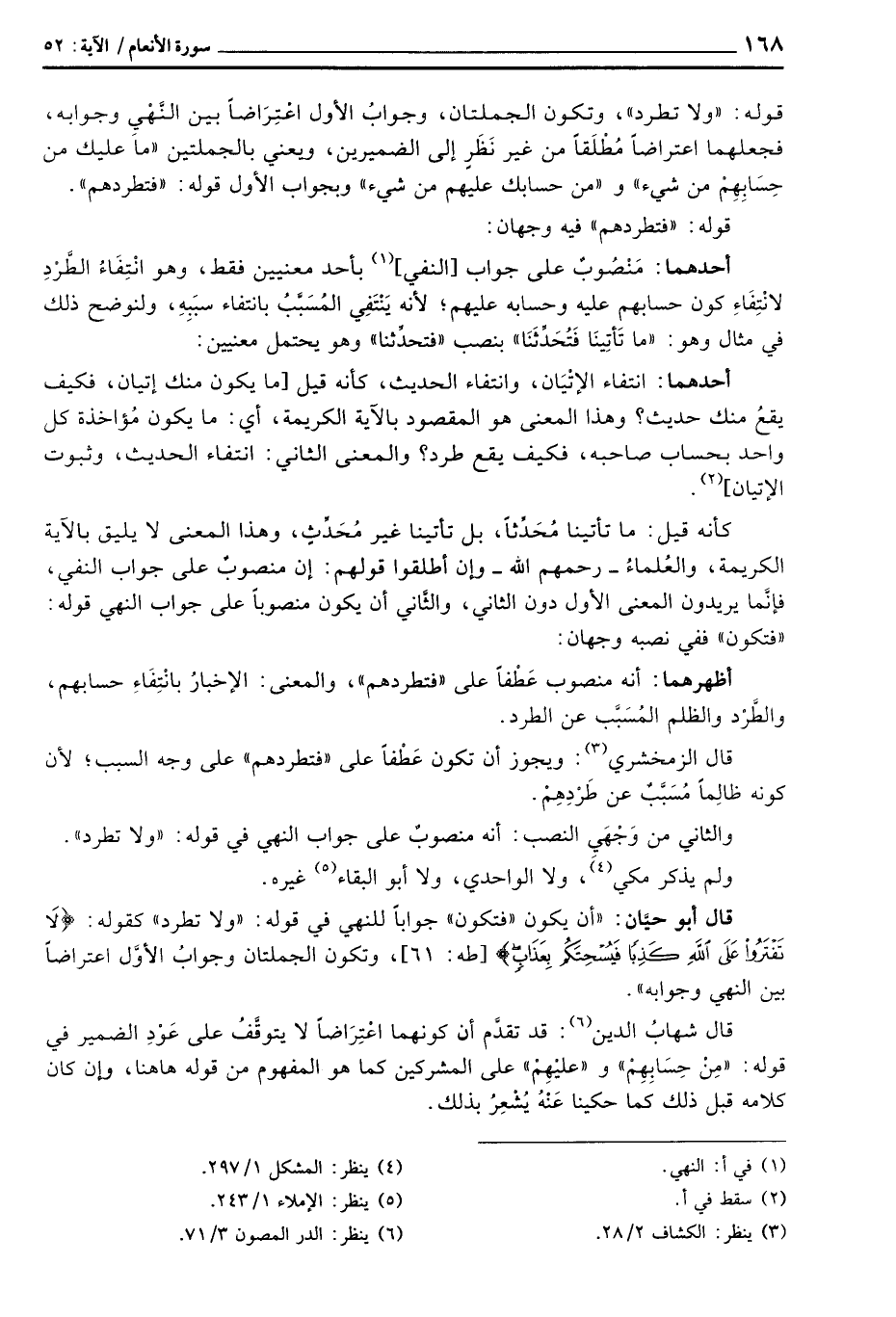 قوله: «ولا تطرد» ، وتكون الجملاتن، وجوابُ الأول اعْتِرَاضاً بين النَّهْي وجوابه، فحعلهما اعراضاً مُطْلَقاً من غير نَظَرٍ إلى الضميرين، ويعني بالجملتين «ما عليك من حِسَابِهِمْ من شيء» و «من حسابك عليم من شيء» وبجواب الأول قوله: «فتطردهم» .