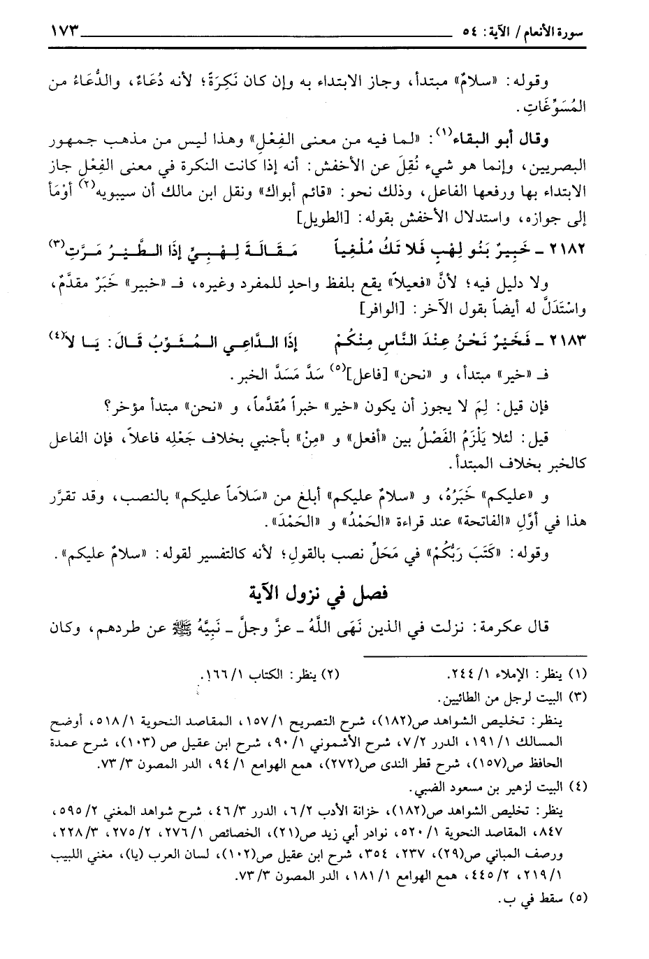 وقال أبو البقاء: «لما فيه من معنى الفِعْلِ» وهذا ليس من مذهب جمهور البصريين، وإنماهو شيء نُقِلَ عن الأخفش: أنه إذا كانت النكرة في معنى الفِعْل جاز الابتداء بها ورفعها الفاعل، وذلك نحو: «قائم أبواك» ونقل ابن مالك أن سيبويه أوْمَأ إلى جوازه، واستدلال الأخفش بقوله: [الطويل]