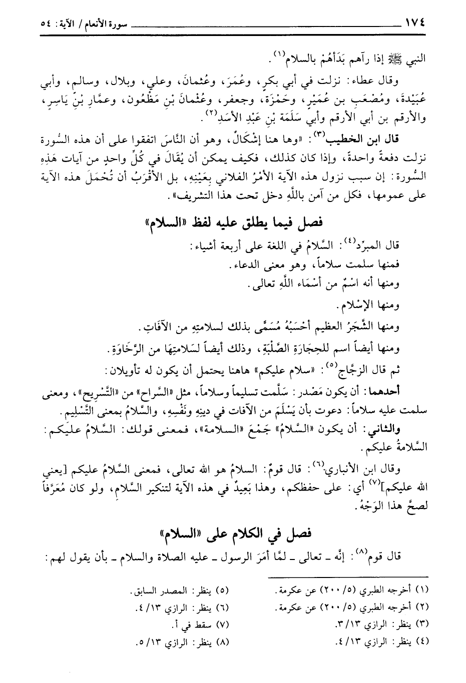 وقال ابن الأنباري: قال قومٌ: السلامُ هو الله تعالى، فمعنى السَّلامُ عليكم [يعني الله عليكم] أي: على حفظكم، وهذا بَعِيدٌ في هذه الآية لتنكير السَّلامِ، ولو كان مُعَرَّفاً لصحَّ هذا الوَجْهُ.