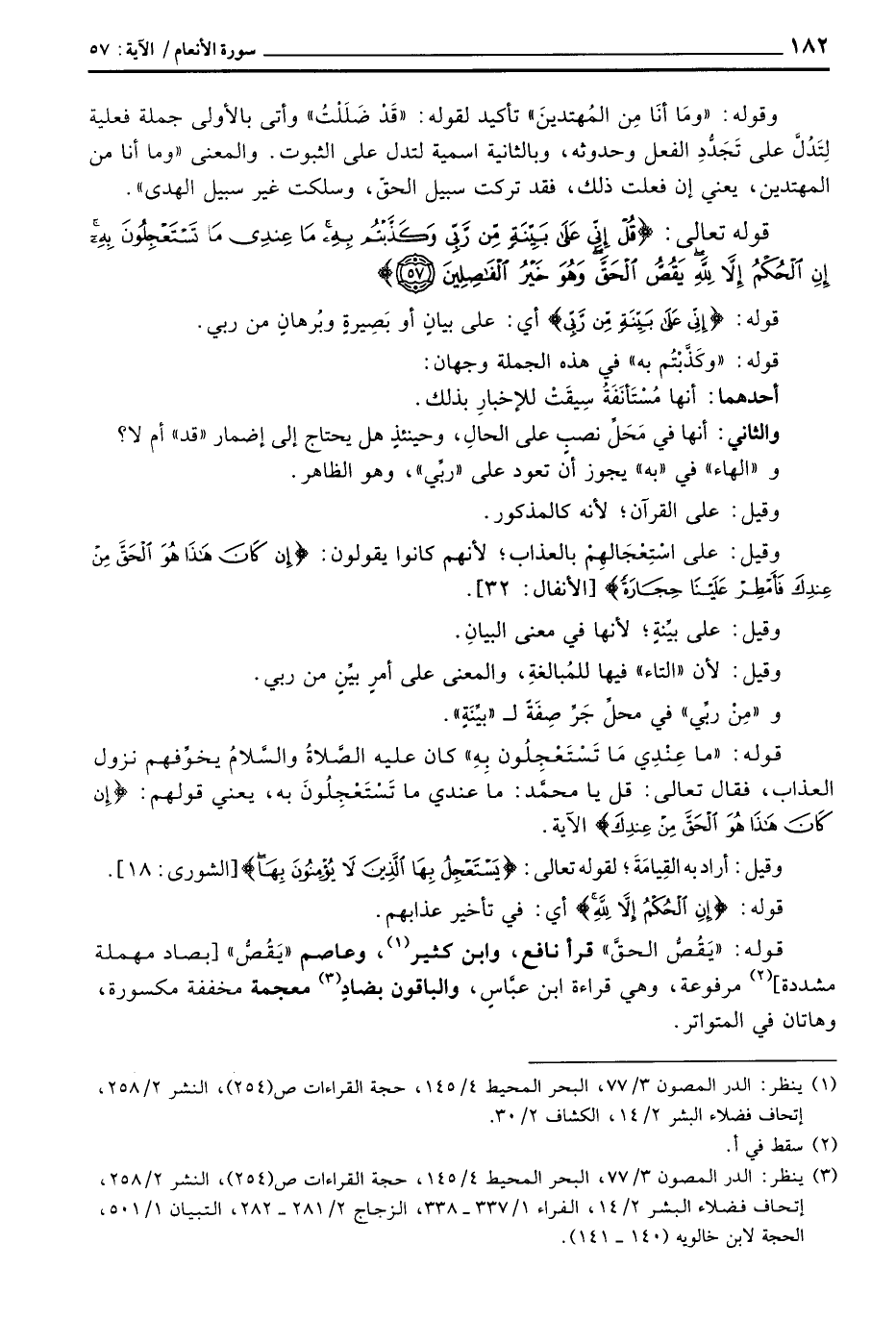 قوله: «يَقُصُّ الحقَّ» قرأ نافع، وابن كثير، وعاصم «يَقُصُّ» [بصاد مهملة مشددة] مرفوعة، وهي قاءة ابن عبَّاسٍ، والباقون بضادٍ معجمة مخففة مكسورة، وهاتان في المتواترة.