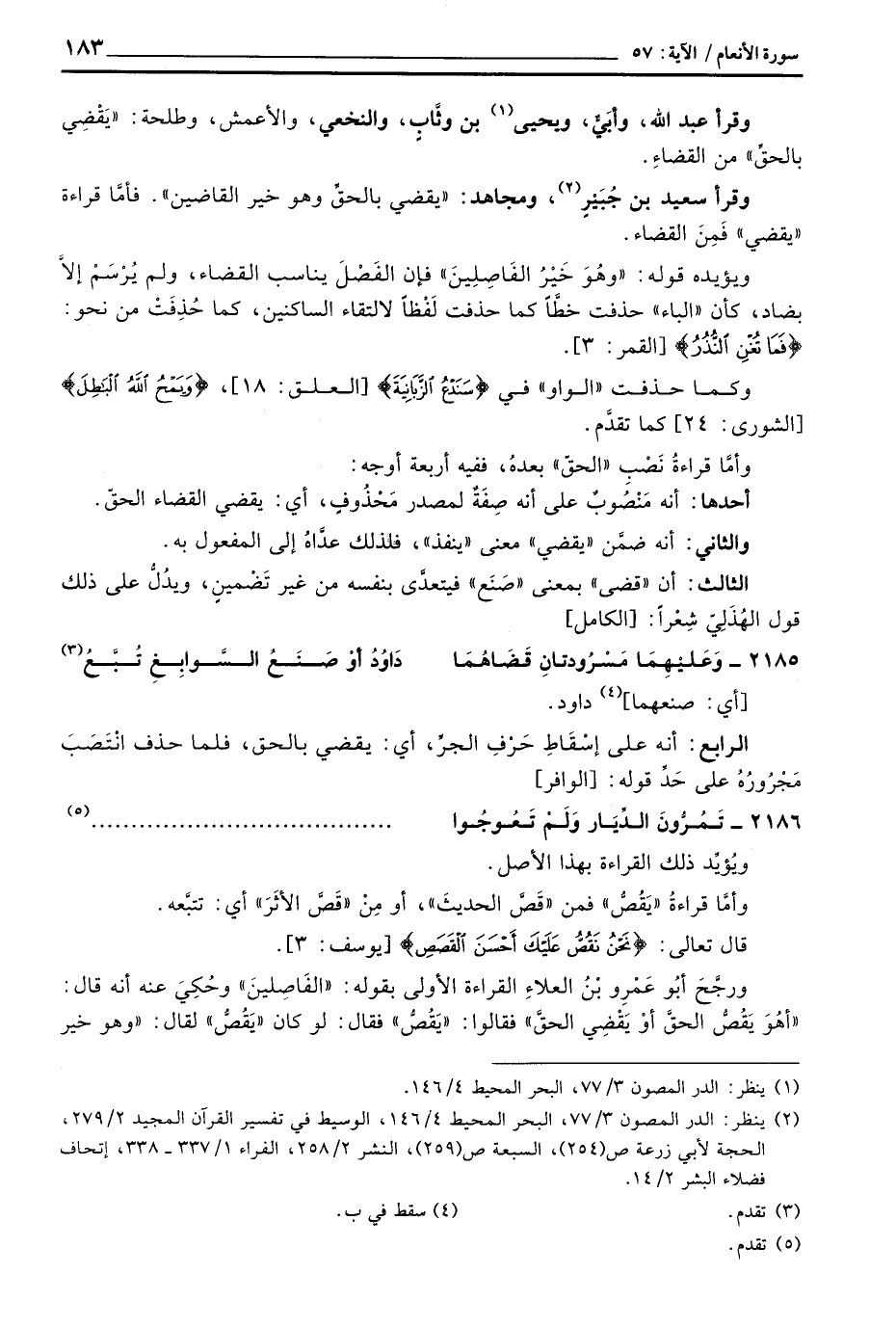 ورجَّحَ أبُو عَمْرِو بْنُ العلاءِ القراءة الأولى بقوله: «الفَاصِلينَ» وحُكِيَ عنه أنه ق: «أهُوَ يَقُصُّ الحقَّ أوْ يَقْضِي الحقَّ» فقالوا: «يَقُصُّ» فقال: لو كان «يَقُصُّ» لقال: «وهو خير