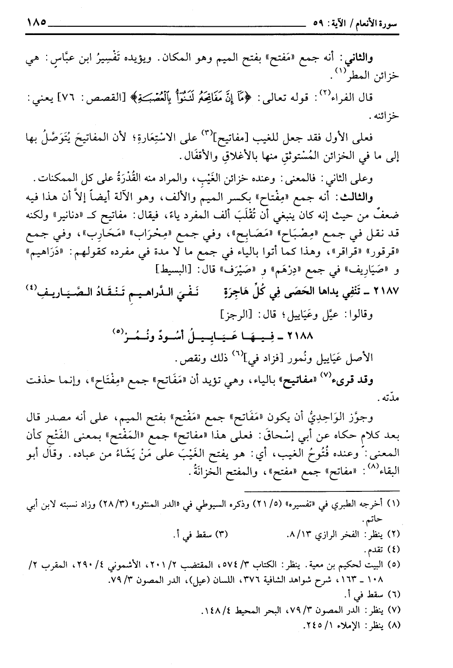 والثالث: أنه جمع «مِفْتاح» بكسر الميم والألف، وهو الآلة أيضاً إلاَّ أن هذا فيه ضعفٌ من حيث إنه كان ينبغي أن تُقْلَبَ ألف المفرد ياءً، فيقال: مفاتيح ك «دنانير» ولكنه قد نقل في جمع «مِصْبَاح» «مَصَابِح» ، وفي جمع «مِحْرَاب» «مَحَارِب» ، وفي جمع «قرقور» «قراقر» ، وهذا كما أتوا بالياء في جمع ما لا مدة في مفرده كقولهم: «دَرَاهيم» و «صَيَارِيف» في جمع «دِرْهَم» و «صَيْرَف» قال: [البسيط]