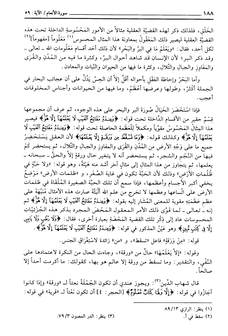 الخَلْقِ، فلذلك ذكر لهذه القضيَّةِ العقلية مِثالاً من الأمور المَحْسُوسةِ الداخلة تحت هذه القضيَّة العقلية ليصير ذلك المَعْقُولُ بمعاونة هذا المثال المحسوس مَعْلُوماً [مفهوماً] لكل أحد، فقال: «ويَعْلَمُ مَا فِي البرِّ والَحْرِ» لأن ذلك أحَد أقسام مَعْلُوماتِ الله - تعالى - وقد ذكر البر؛ لأن الإنسان قد شاهد أحوال البرِّ، وكثرة ما فيه من المُدُنِ والقُرَى والمَفَاوِزِ والجبالِ والتِّلالِ، وكثرة ما فيها من الحيوان والنَّبات والمعادن.