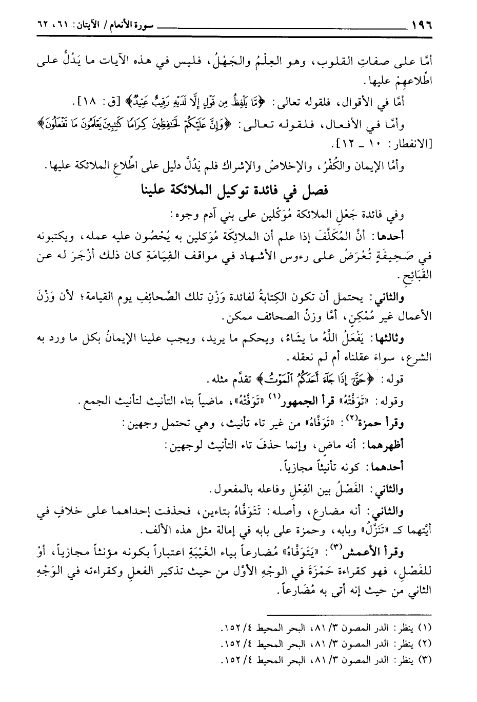 وأمَّا في الأفعال، فلقوله تعالى: {وَإِنَّ عَلَيْكُمْ لَحَافِظِينَ كِرَاماً كَاتِبِينَ يَعْلَمُونَ مَا تَفْعَلُونَ} [الانفطار: 10 - 12] .