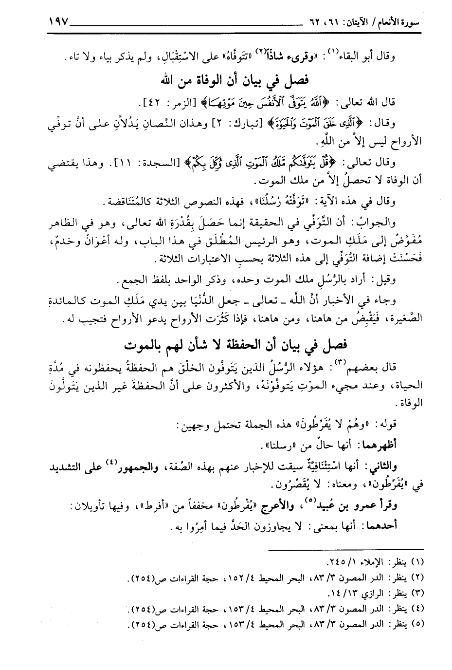 قال بعضهم: هؤلاء الرُّسُلُ الذين يَتَوفَّون الخلْقَ هم الحفظةُ بحفظونه في مُدَّةِ الحياة، وعند مجيء الموْتِ يِتوفَّوْنَهُ، والأكثرون على أنَّ الحفظةَ غير الذين يَتَولَّونَ الوفاة.