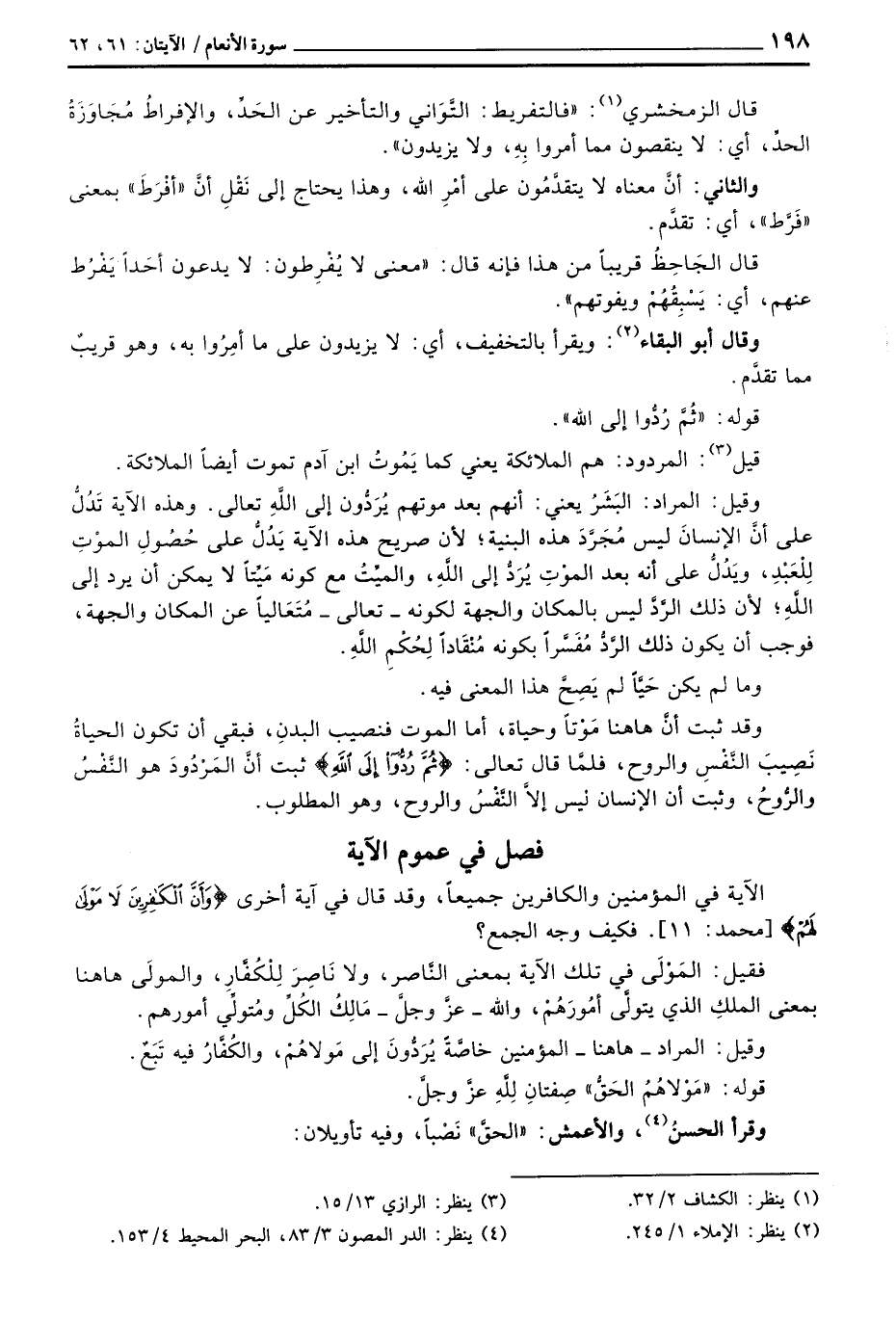 وقيل: المراد: البَشَرُ يعني: أنههم بعد موتهم يُرَدُّون إلى اللَّهِ تعالى. وهذه الآية تَدُلُّ على أنَّ الإنسانَ ليس مُجَرَّدَ هذه البنية؛ لأن صريح هذه الآية يَدُلُّ على حُصُولِ الموْتِ لِلْعَبْدِ، ويَدُلُّ على أنه بعد الموْتِ يُردُّ إلى اللَّهِ، والميِّتُ مع كونه مَيِّتاً لا يمكن أن يرد إلى اللَّهِ؛ لأن ذلك الرَّدَّ ليس بالمكان والجهة لكونه - تعالى - مُتَعَالياً عن المكان والجهة، فوجب أن يكون ذلك الرَّدُّ مُفَسَّراً بكونه مُنْقَاداً لِحُكْمِ اللَّهِ.