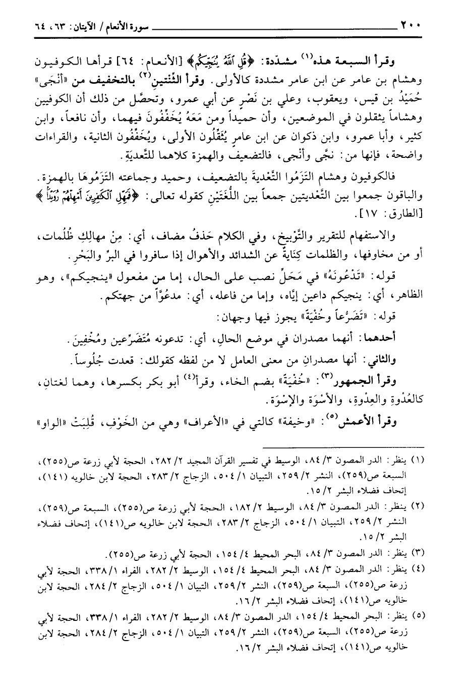 وقرأ السبعة هذه مشدّدة: {قُلِ الله يُنَجِّيكُم} [الأنعام: 64] قرأها الكوفيون وهشام بن عامر عن أبي عام كالأول. وقرأ الثِّنْتينِ بالتخفيف من «أنْجَى» حُمَيْدُ بن قيس، ويعقوب، وعلي بن نَصْرٍ عن أبي عمرو، وتحصَّل من ذلك أن الكوفيين وهشاماً يثقلون في الموضعين، وأن حميداً ومن مَعَهُ يُخَفِّفُونَ فيهما، وأن نافعاً، وابن كثير، وأبا عمرو، وابن ذكوان عن ابن عامرٍ يُثَقِّلُون الأولى، ويُخَفِّفُون الثانية، والقراءات واضحة، فإنها من: نجَّى وأنْجى، فالتضعيف والهمزة كلاهما للتَّعديَةِ.
