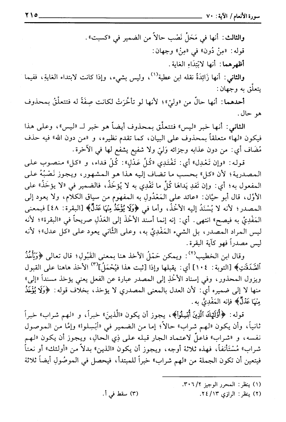 الثاني: أنها خبر «ليس» فتتعلَّق بمحذوف أيضاً وهو خبر ل «ليس» ، وعلى هذا فيكون «لها» متعلقاً بمحذوف على البيان، كما تقتدم نظيره، و «من دون الله» فيه حذف مُضَاف أي: من دون عذابه وجزائه وَليّ ولا شفيع يشفع لها في الآخرة.