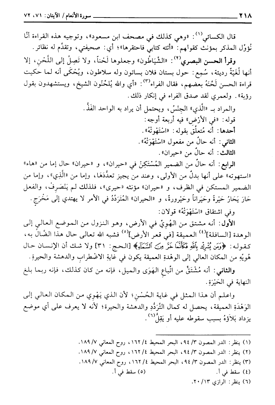 الرابع: أنه حالٌ من الضمير المُسْتَكِنّ في «حيران» ، و «حيران» حال إما من «هاء» «استهوته» على أنها بدلٌ من الأولى، وعند من يجيز تعدُّدَهَا، وإما من «الَّذِي» ، وإما من الضمير المستكن في الظرف، و «حيران» مؤنثة «حيرى» ، فلذلك لم يَنْصَرِفُ، والفعل حَارَ يَحَارُ حَيْرةً وحَيَراناً وحَيْرورةً، و «الحيران» المُتَرَدِّدُ في الأمر لا يهتدي إلى مَخْرَجٍ.
