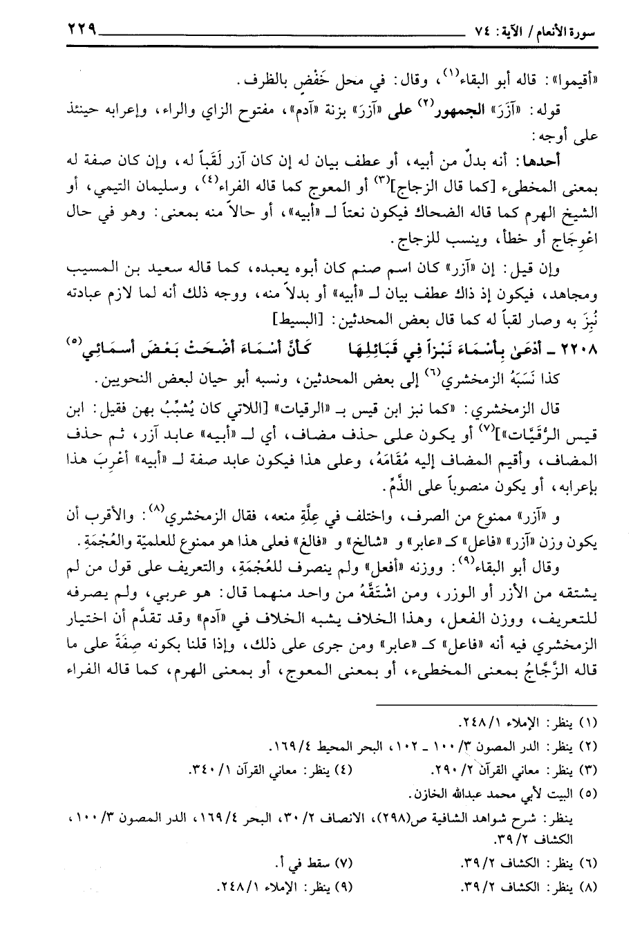 و «آزر» ممنوع من الصرف، واختلف في عِلِّةِ منعه، فقال الزمخشري: والأقرب أن يكون وزن «آزر» «فاعل» ك «عابر» و «شالخ» و «فالغ» فعلى هذا هو ممنوع للعميّة والعُجْمَةِ.