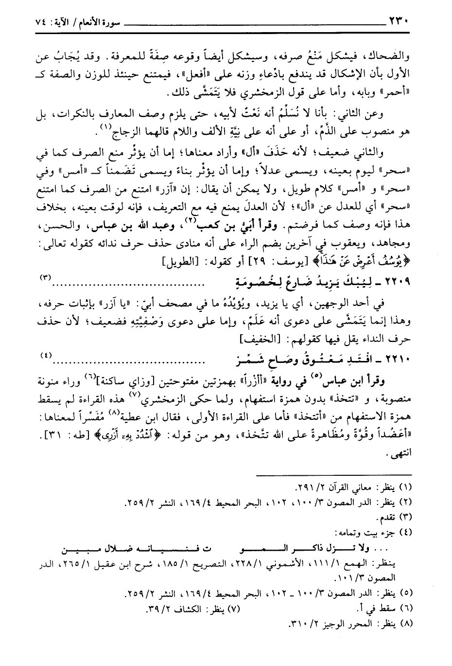 والثاني ضعيف؛ لأنه حَذَفَ «أل» وأراد معناها؛ إما أن يؤثّر منع الصرف كما في «سحر» ليوم بعينه، ويسمى عدلاً؛ وإما أن يؤثِّر بناءً ويسمى تَضَمناً ك «أمس» وفي «سحر» و «أمس» كلام طويل، ولا يمكن أن يقال/: إن «آزر» امتنع من الصرف كما امتنع «سحر» أي للعدل عن «أل» ؛ لأن العدلَ يمنع فيه مع التعريف، فإنه لوقت بعينه، بخلاف هذا فإنه وصف كما فرضتم. وقرا أبَيُّ بن كعب، وعبد الله بن عباس، والحسن، ومجاهد، ويعقوب في آخرين بضم الراء على أنه منادى حذف حرف ندائه كقوله تعالى: {يُوسُفُ أَعْرِضْ عَنْ هذا} [يوسف: 29] أو كقوله: [الطويل]