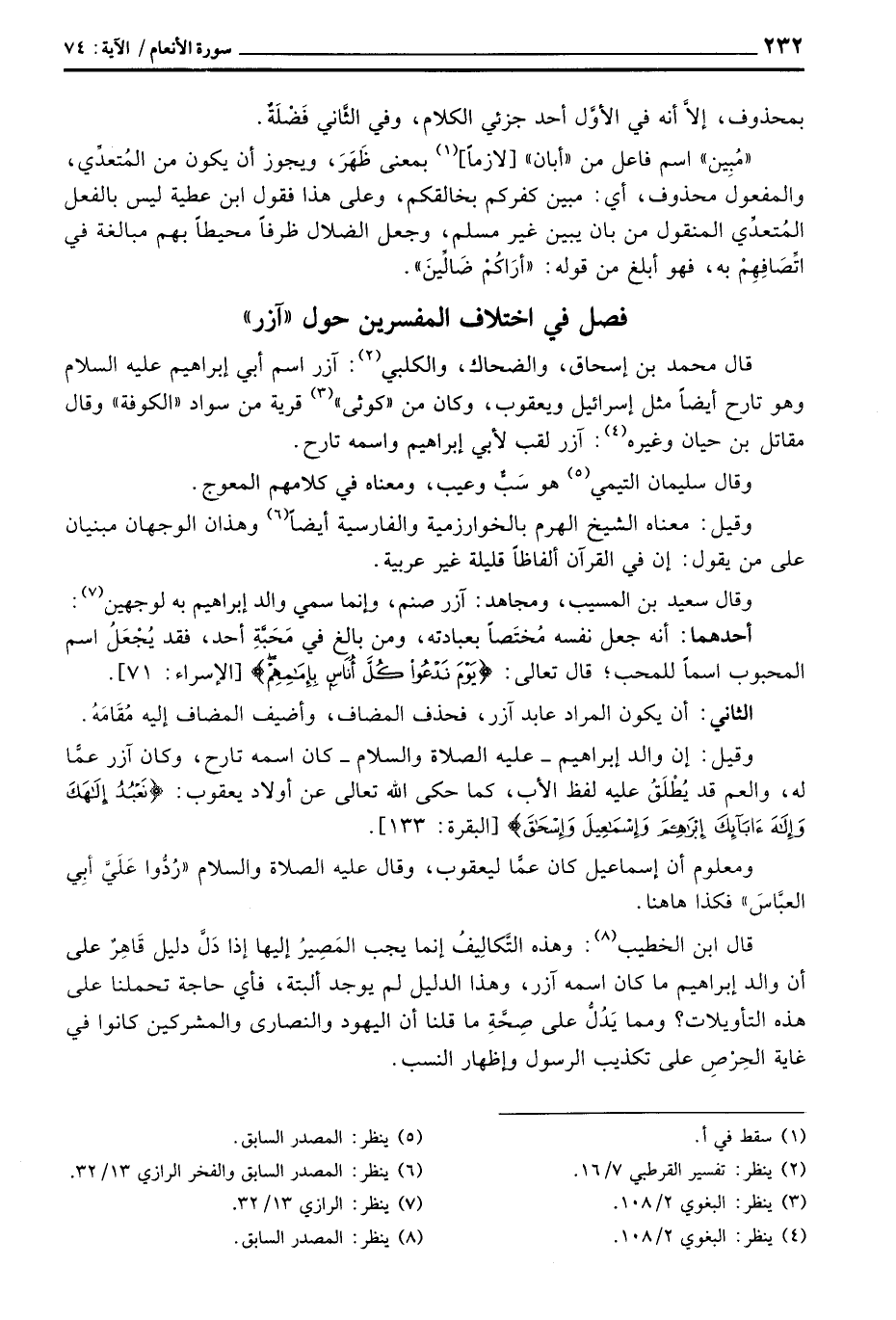 قال ابن الخطيب: وهذه التَّكالِيفُ إنما يجب المَصِيرُ إليها إذا دَلَّ قَاهِرٌ على أن والد إبراهيم كا كان اسمه آزر، وهذا الدليل لم يوجد ألبتة، فأي حاجة تحملنا لعى هه التأويلات؟ ومما يَدُلُّ على صِحَّةِ ما قلناه أن اليهود والنصارى والمشركين كانوا في غاية الحِرْصِ على تكذيب الرسول وإظهار النسب.