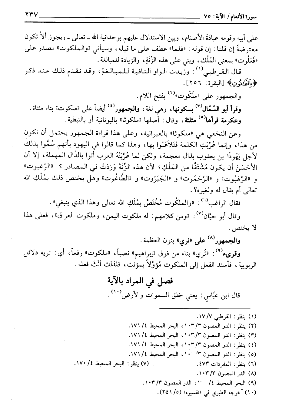 على أبيه وقومه عبادَةَ الأصنام، وبين الاستدلال عليهم بوحدانية الله - تعالى - ويجوز ألاَّ تكون معترضةً إن قلنا: إن قوله: «فلما» عطف على ما قبله، وسيأتي «والملكوت» مصدر على «فَعَلُوت» بمعنى المُلْك، وبني على هذه الزِّنَةِ، والزيادة للمبالغة.