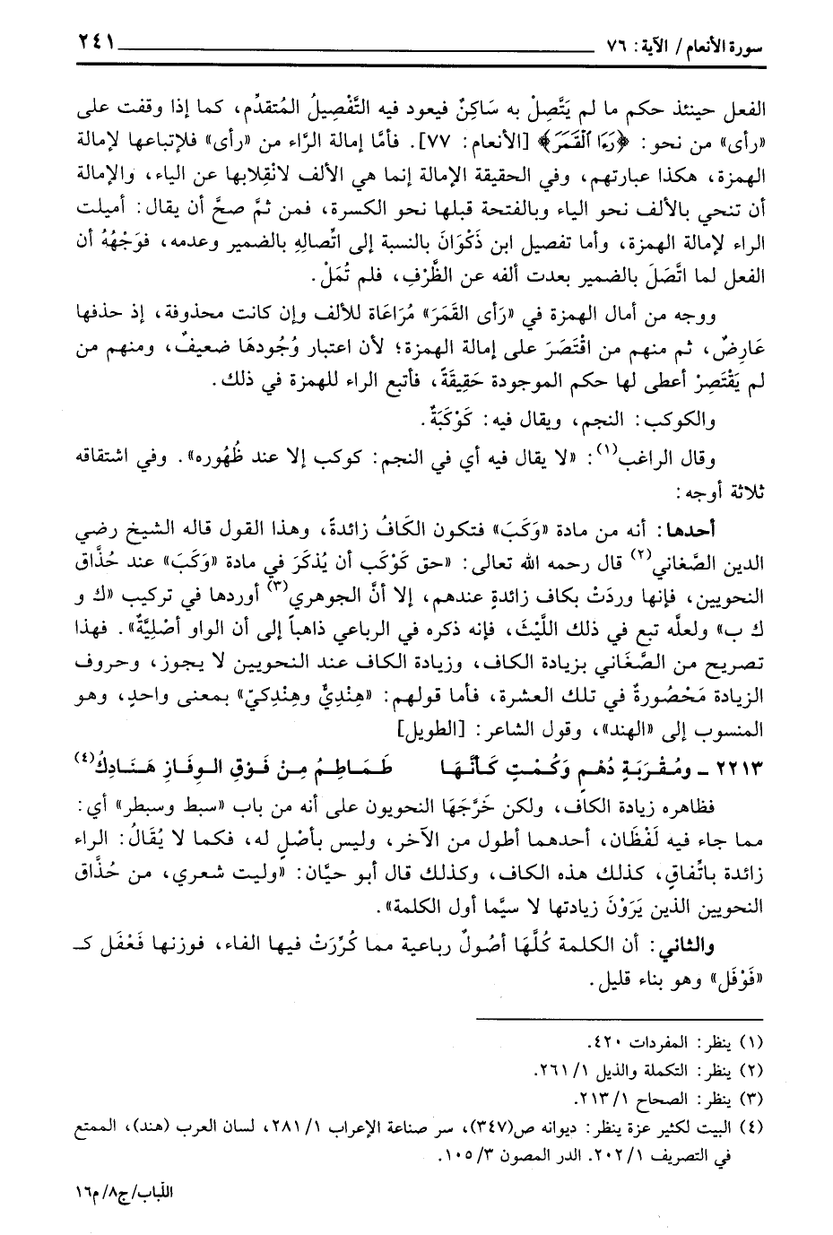 أحدها: أنه من مادة «وَكَبَ» فتكون الكَافُ زائدةً، وهذا القول قاله الشيخ رضي الدين الصَّغاني قال رَحِمَهُ اللَّهُ تعالى: «حق كَوْكَب أن يُذكَرَ في مادة» وَكَبَ «عن حُذَّاق النحويين، فإنها وردَتْ بكاف زائدةٍ عندهم، إلا أنَّ الجوهري أوردها في تركيب» ك وك ب «ولعلَّه تبع في ذلك اللَّيْثَ، فإنه ذكره في الرباعي ذاهباً إلى أن الواو أصْلِيَّةٌ» . فهذا تصريح من الصَّغَاني بزيادة الكافن وزيادة الكاف عند النحويين لا يجوز، وحروف الزيادة مَحْصُورةٌ في تلك العشرة، فأما قولهم: «هِنْدِيُّ وهِنْدِكيّ» بمعنى واحدٍ، وهو المنسوب إلى «الهند» ، وقول الشاعر: [الطويل]