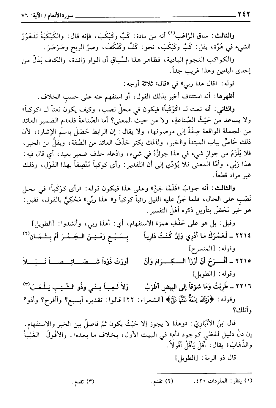 والثاني: أنه نعت ل «كَوْكَباً» فيكون في محلِّ نصب، وكيف يكون نعتاً ل «كوكباً» ولا يساعد من حَيْثُ الصِّناعةِ، ولا من حيث المعنى؟ أما الصِّناعةُ فلعدم الضمير العائد من الجملة الواقعة صِفَةً إلى موصوفها، ولا يقال: إن الرابط حَصَلَ باسم الإشارة؛ لأن من الجملة الواقعة صِفَةً إلى موصوفها، ولا يقال: إن الرابط حَصَلَ باسم الإشارة؛ لأن ذلك خَاصُّ بباب المبتدأ والخبر، ولذلك يكثر حَذْفُ العائد من الصِّفة، ويقلُّ من الخبر، فلا يَلْزَمُ من جوازِ شيء في هذا جوازُهُ في شيء، وادِّعاء حذفت ضمير بعيد، أي قال فيه: هذا رَببَّي، وأمَّا المعنى فلا يُؤدِّي إلى أن التَّقدير: رأى كوكباً مُتَّصِفاً بهذا القَوْلِ، فقيل: هو خبر مَحْضٌ بتأويل ذكره أهْلُ التفسير.