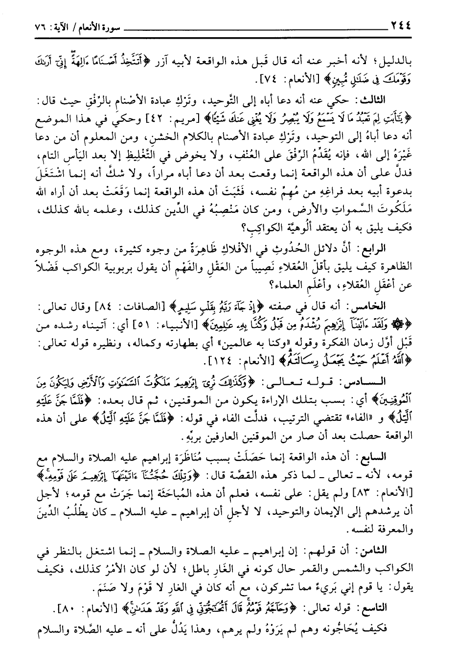 {وَتِلْكَ حُجَّتُنَآ آتَيْنَاهَآ إِبْرَاهِيمَ على قَوْمِهِ} [الأنعام: 83] ولم يقل: على نفسه، فعلم أن هذه المُبَاحَثَة إنما جَرَتْ مع قومه؛ لأجل أن يرشدهم إلى الإيمان والتوحيد، لا لأجلِ أن إبراهيم - عليه السلام - كان يطْلُبُ الدِّينَ والمعرفة لنفسه.