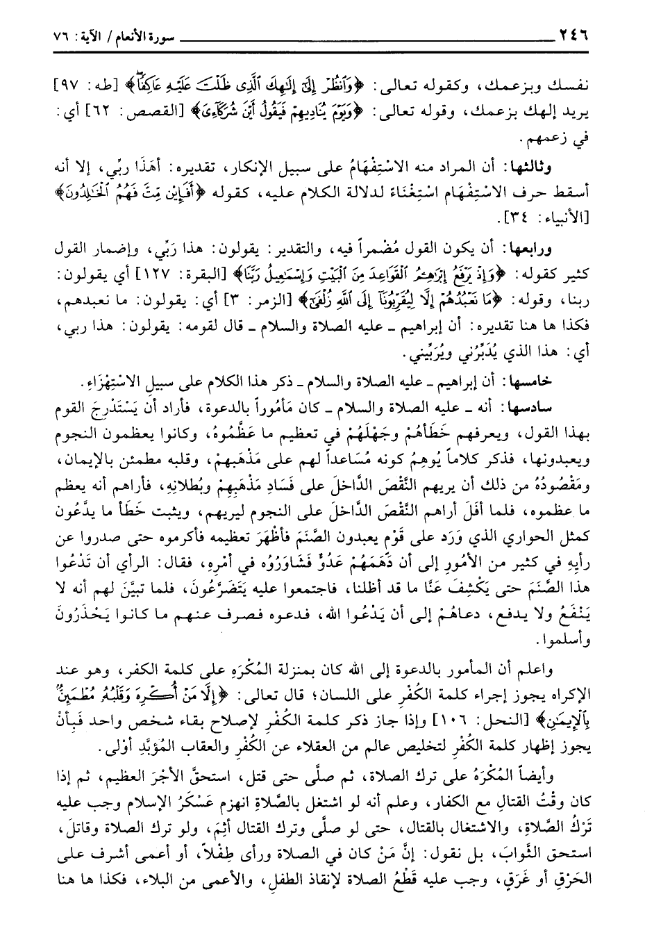 وأعلم أن المأمور بالدعوة إلى الله كان بمنزلة المُكْرَهِ على كلمة الكفرن وهو عن الإكرام يجوز إجاء كلمة الكُفْرِ على اللسان؛ قال تعالى {إِلاَّ مَنْ أُكْرِهَ وَقَلْبُهُ مُطْمَئِنٌّ بالإيمان} [النحل: 106] وإذا جاز ذكر كلمة الكُفْرِ لإصلاح بقاء شخص واحد فَبِأنْ يجوز إظهار كلمة الكُفْرِ لتخليص عالم من العقلاء عن الكُفْرِ والعقاب المُؤبَّدِ أوْلى.