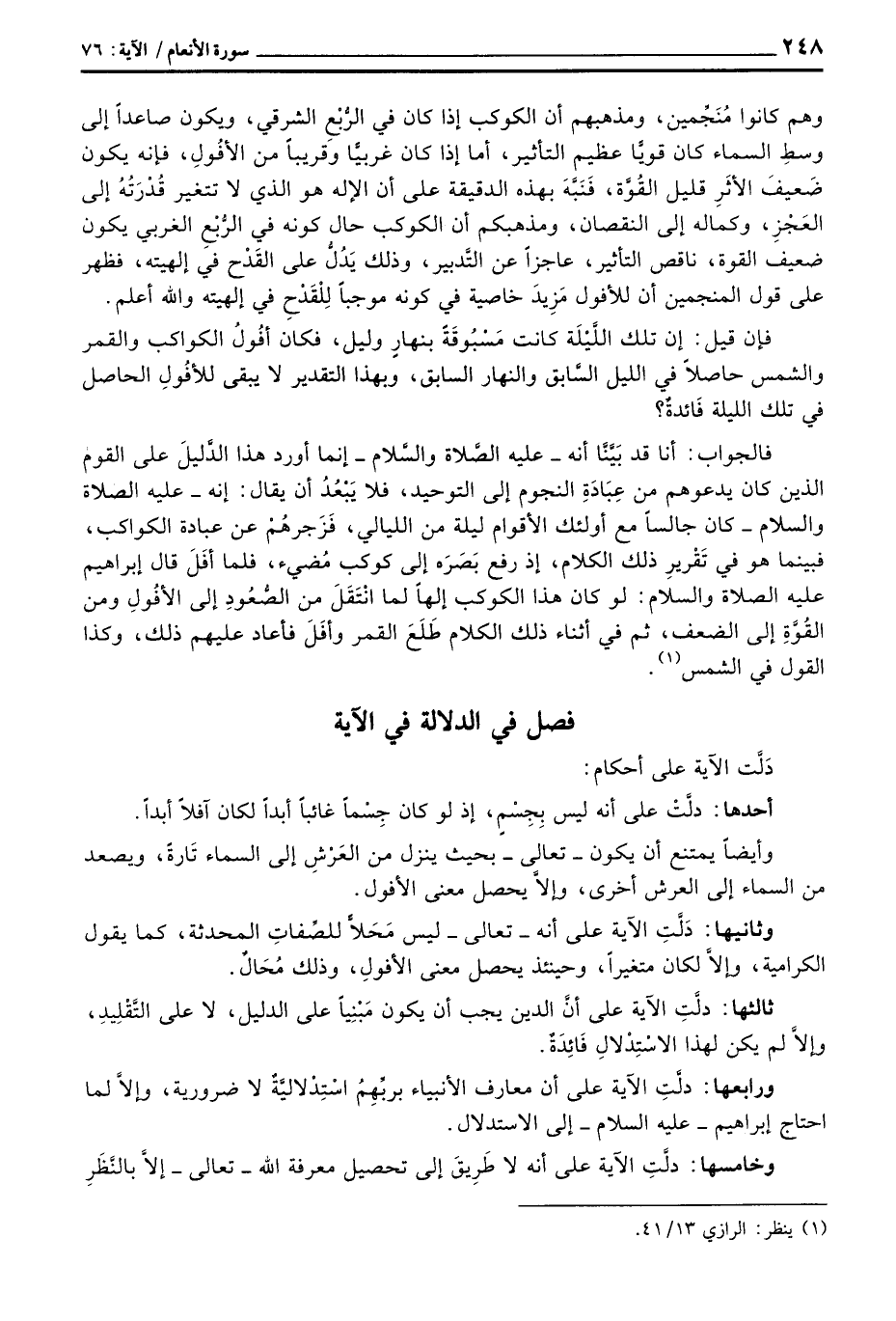وهم كانوا مُنَجِّمين، ومذهبهم أن الكوكب إذا كان الرُّبْعِ الشرقي، ويكون صاعداً إلى وسطِ السماء كان قويَّاً عظيم التأثير، أما إذا كان غربيَّا وقريباً ومن الأفُولِ، فإنه يكون ضَعيفَ الأثَر قليل القُوَّة، فَنَبَّهَ بهذه الدقيقة على ان الإله هو الذي تتغير قُدْرَتُهُ إلى العَجْزِ، وكماله إلى النقصان، ومذهبكم أن الكوكب حال كونه في الرُّبْعِ الغربي يكون ضعيف القوة، ناقص التأثيرن عاجزاً عن التَّدبير، وذلك يَدُلُّ على القَدْح في إلهيته، فظهر على قول المنجمين أن للأفول مَزِيدَ خاصية في كونه موجباً لِلْقَدْح في إلهيته والله أعلم.