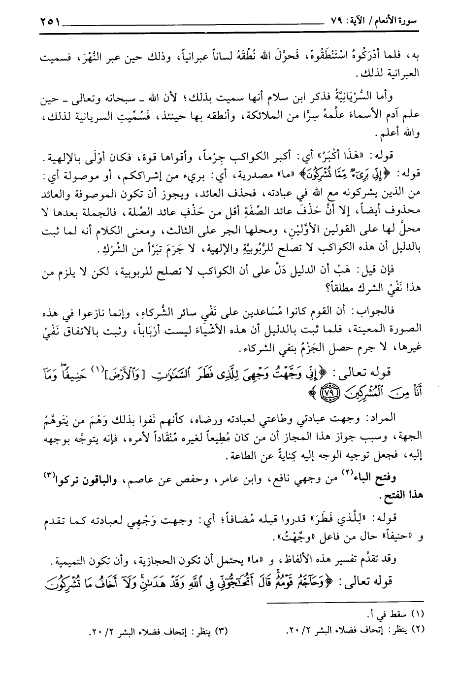 قوله: «لِلَّذي فَطَرَ» فدروا قبله مُضافاً؛ أي: وجهت وَجْهِي لعبادته كما تقدم و «حنيفاً» حال من فاعل «وجَّهْتُ» .