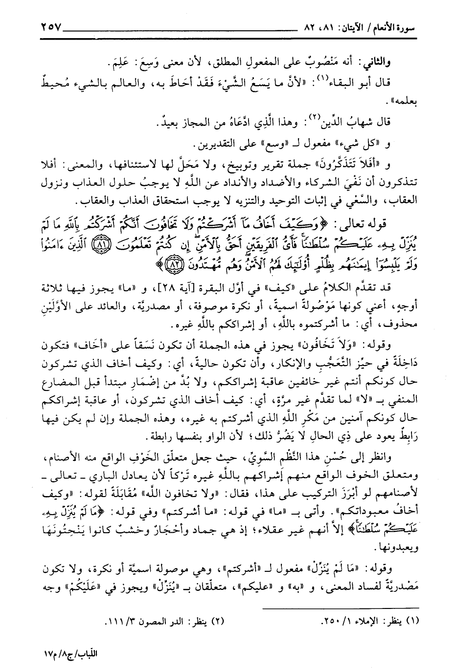 وانظر إلى حُسْنِ هذا النَّظْمِ السَّويِّن حيث جعل متعلّق الخَوْفِ الواقع منه الأصنام، ومتعلق الخوف الواقع منهم إشاركهم باللَّهِ غيره تَرْكاً لأن يعادل الباري - تعالى - لأصنامهم لو أبْرَزَ التركيب على هذا، فقال: «ولا تخافون اللَّه» مُقَابَلَةً لقوله: «وكيف أخافُ معبوداتكم» . وأتى ب «ما» في قوله: «ما أشركتم» وفي قوله: {مَا لَمْ يُنَزِّلْ بِهِ عَلَيْكُمْ سُلْطَاناً} إلاَّ أنهم غير عقلاء؛ إذ هي جماد وأحْجَارٌ وخشبٌ كانوا يَنْحِتُونَهَا ويعبدونها.