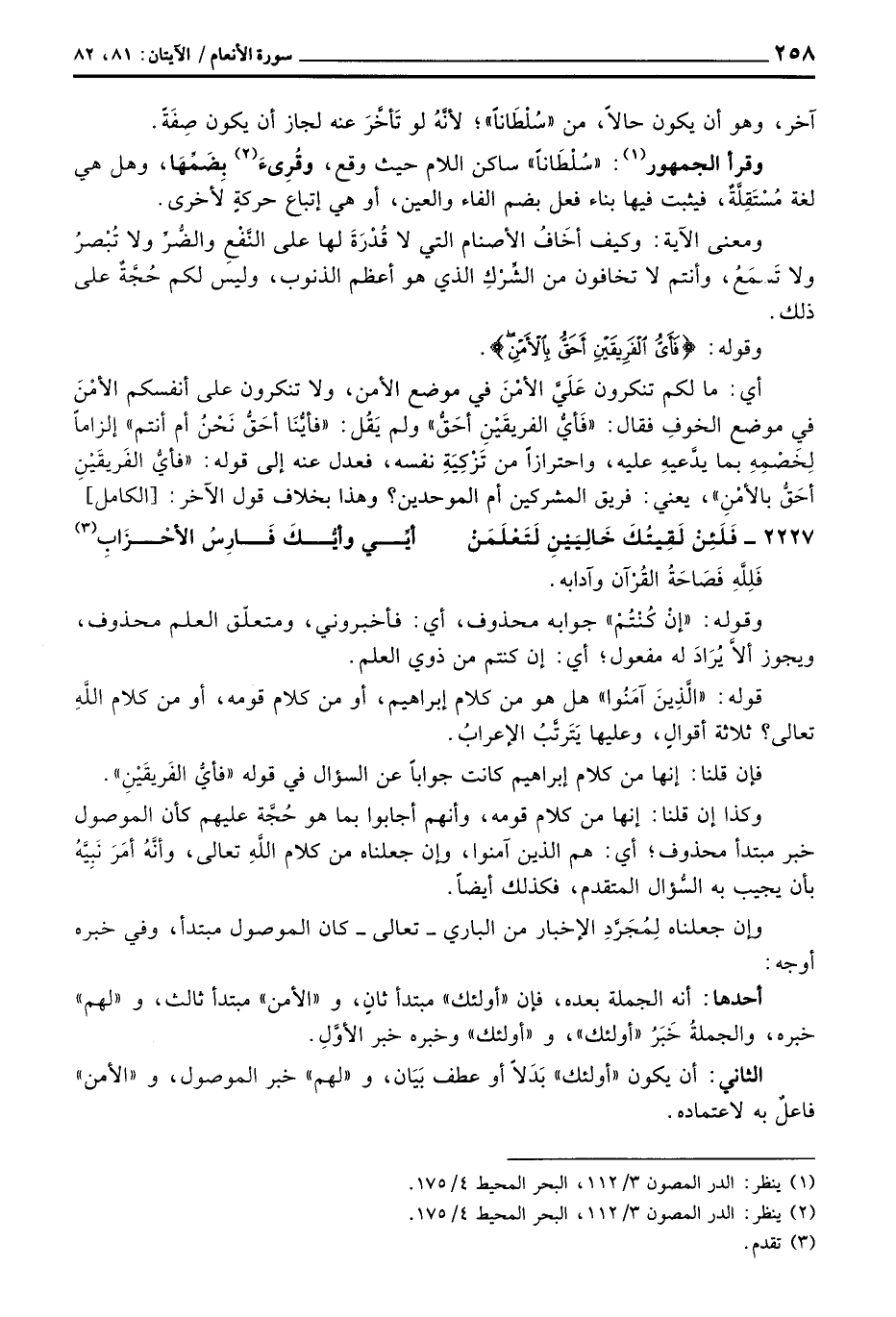 قوله: «الَّذِينَ آمَنُوا» هل هو من كلام إبراهيم، أو من كلامه قومه، أو من كلام اللَّهِ تعالى؟ ثلاثة أقوالٍ، وعلهيا يَتَرتَّبُ الإعرابُ.