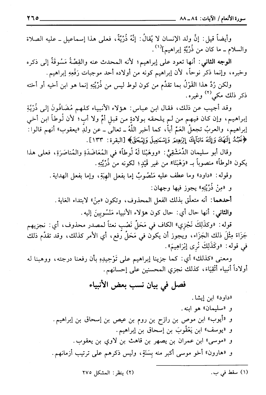 وقد أجيب عن ذلكن فقال ابن عباس: هؤلاء الأنبياء كلهم مُضَافُونَ إلى ذُرِّيَّةِ إبراهيم، وإن كان فيهم من لم يلحقه بولادةٍ من قبلِ أمِّ ولا أبٍ؛ لأن لُوطاً ابن أخي إبراهيم، والعربُ تجعلُ العَمَّ أباً، كما أخبر اللَّهُ - تعالى - عن ولدِ «يعقوب» أنهم قالوا: {نَعْبُدُ إلهك وإله آبَائِكَ إِبْرَاهِيمَ وَإِسْمَاعِيلَ وَإِسْحَاقَ} [البقرة: 133]