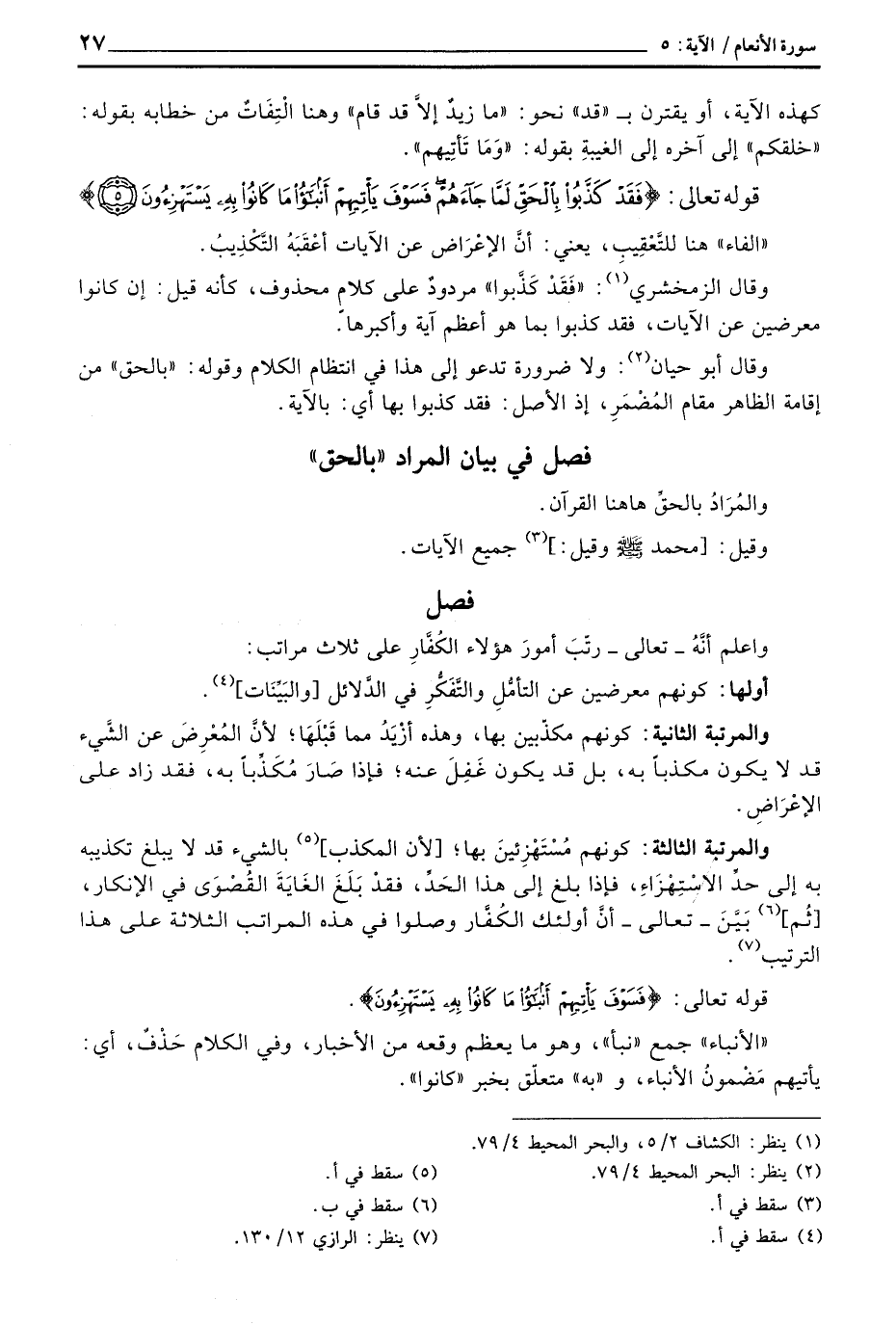 وقال الزمخشري: «فَقَدْ كَذَّبوا» مردودٌ على كلام محذوف، كأنه قيل: إن كانوا معرضين عن الآيات، فقد كذبوا بما هو أعظم آية وأكبرها.