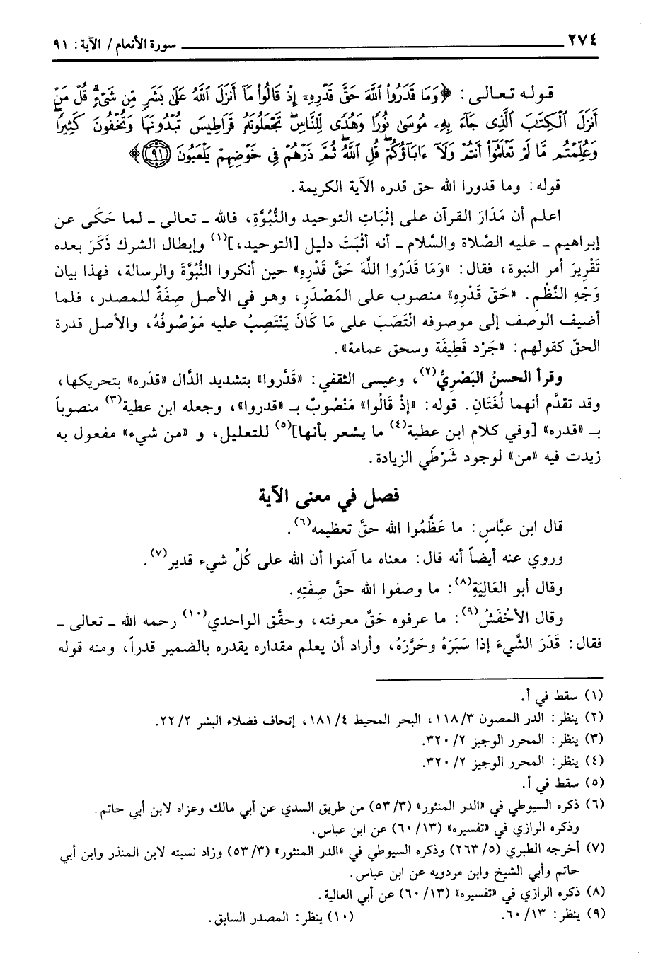 اعلم أن مَدَارَ القرآن على إثْبَاتِ التوحيد والنُّبُوَّةِ، فالله - تعالى - لما حَكَى عن إبراهيم - عليه الصَّلاة والسَّلام - أنه أثْبَتَ دليل [التوحيد،] وإبطال الشرك ذَكَرَ بعده تَقْرِيرَ أمر النبوة، فقال: «وَمَا قَدَرُوا اللَّهَ حَقَّ قَدْرِهِ» حين انركوا النُّبُوَّةَ والرسالة، فهذا بيان وَجْهِ النَّظْمِ. «حَقّ قَدْرهِ» منصوب على المَصْدَرِ، وهو في الأصل صِفَةٌ للمصدر، فلما أضيف الوصف إلى موصوفه انْتَصَبَ على مَا كَانَ يَنْتَصِبٌ عليه مَوْصُوفُهُ، والأصل قدره الحقّ كقولهم: «جَرْد قَطِيفَة وسحق عمامة» .