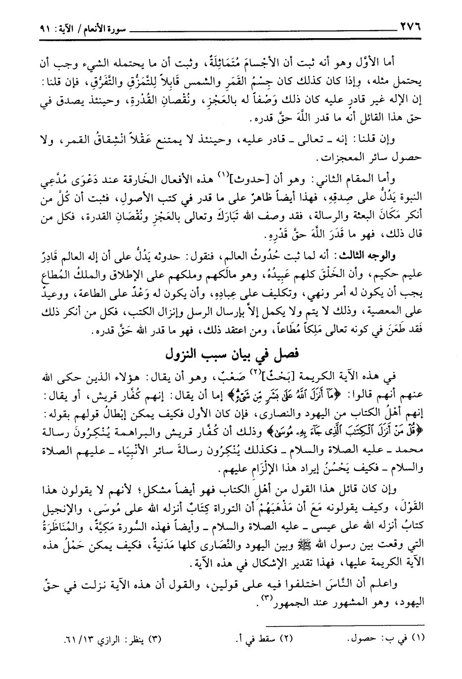 وأما المقام الثاني: وهو أن [حدوث] هذه الأفعال الخَارقة عند دَعْوَى مُدَّعِي النبة يَدُلُّ على صِدقِهِ، فهذا أيضاً ظاهرٌ على ما قدر في كتب الأصولِ، فثبت أن كُلِّ من أنكر مَكَانَ البعثة والرسالة، فقد وصف الله تَبَارَكَ وتعالى بالعَجْزِ ونُقْصَانِ القدرة، فكل من قال ذلك، فهو ما قَدَرَ اللَّهَ حقَّ قَدْرِهِ.