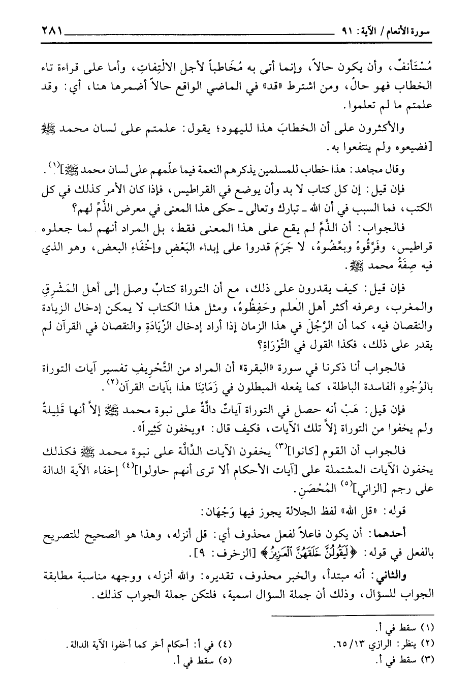 فالجواب أن القوم [كانوا] يخفون الآيات الدَّالَّة على نبوة محمد صَلَّى اللَّهُ عَلَيْهِ وَسَلَّم َ فكذلك يخفون الآيات المشتملة على [آيات الأحكام ألا ترى أنهم حاولوا] إخفاء الآية الدالة على رجم [الزاني] المُحْصَنِ.