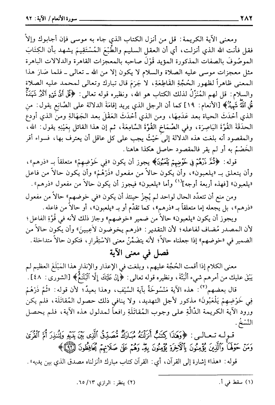قوله: {ثُمَّ ذَرْهُمْ فِي خَوْضِهِمْ يَلْعَبُونَ} يجوز أن يكون «فِي خَوْضِهِمْ» متعلقاً ب «ذرهم» ، وأن يتعلق ب «يلعبون» ، وأن يكون حالاً من مفعول «ذَرْهُمْ» وأن يكون حالاً من فاعل «يلعبون» [فهذه أربعة أوجه] وأما «يلعبون» فيجوز أن يكون حالاً من مفعول «ذرهم» .