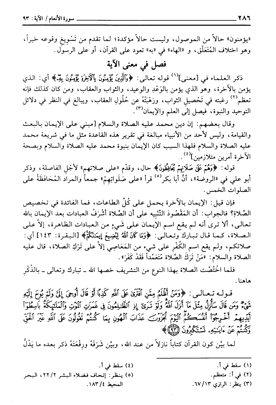 فإن قيل: الإيمان بالآخرة يحمل كُلِّ الطاعات، فما الفائدة في تخصيص الصَّلاةِ؟ فالجواب: أن المَقْصُودَ التَّنْبيه على أن الصَّلاة أشْرَفُ العبادات بعد الإيمان بالله تعالى، ألا ترى أنه لم يقع اسم الإيمان على شَيءٍ من العبادات لاظاهرة، إلاَّ على الصلاة، كما قال تبارك وتعالى: {وَمَا كَانَ الله لِيُضِيعَ إِيمَانَكُمْ} [البقرة: 143] أي: صلاتكم، ولم يقع اسم الكُفرِ على شيء من المَعَاصِ] إلاَّ على تَرْكَ الصلاة، قال عَلَيْهِ الصَّلَاة وَالسَّلَام ُ:» مَنْ تَرَكَ الصَّلاة مُتَعَمِّداً فَقَدْ كَفَرَ «.