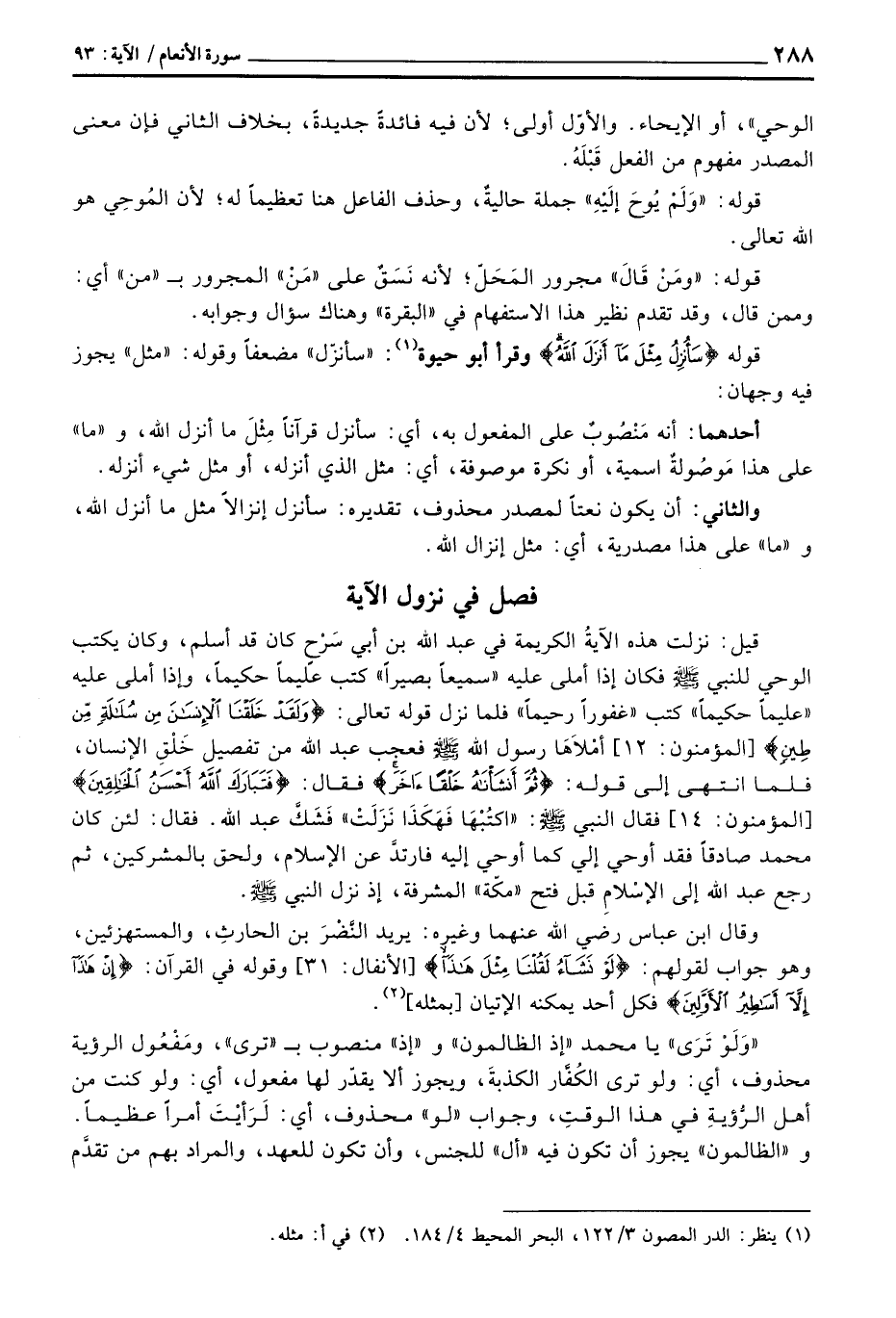 قيل: نزلت هذه الآيةُ الكريمة في عبد الله بن أبي سَرْحِ كان قد أسلم، وكان يكتب الوحي للنبي صَلَّى اللَّهُ عَلَيْهِ وَسَلَّم َ فكان إذا أملى عليه» سميعاً بصيراً «كتب عليماً حكيماً، وإذا أملى عليه» عليماً حكيماً «كتب» غفوراً رحيماً «فلما نزل قوله تعالى: {وَلَقَدْ خَلَقْنَا الإنسان مِن سُلاَلَةٍ مِّن طِينٍ} [المؤمنون: 12] أمْلاَهَا رسول الله صَلَّى اللَّهُ عَلَيْهِ وَسَلَّم َ فعجب عبد الله من تفصيل خَلْقِ الإنسان، فلما انتهى إلى قوله: {ثُمَّ أَنشَأْنَاهُ خَلْقاً آخَرَ} [المؤمنون: 14] فقال: {فَتَبَارَكَ الله أَحْسَنُ الخالقين} [المؤمنون: 14] فقال النبي صَلَّى اللَّهُ عَلَيْهِ وَسَلَّم َ:» اكتُبْهَا فَهَكَذَا نَزَلَتْ «فَشَكَّ عبد الله. فقال: لئن كان محمد صادقاً فقد أوحي إلي كما أوحي إليه فارتدَّ عن الإسلام، ولحق بالمشركين، ثم رجع عبد الله إلى الإسْلام قبل فتح» مكّة «المشرفة، إذ نزل النبي صَلَّى اللَّهُ عَلَيْهِ وَسَلَّم َ.