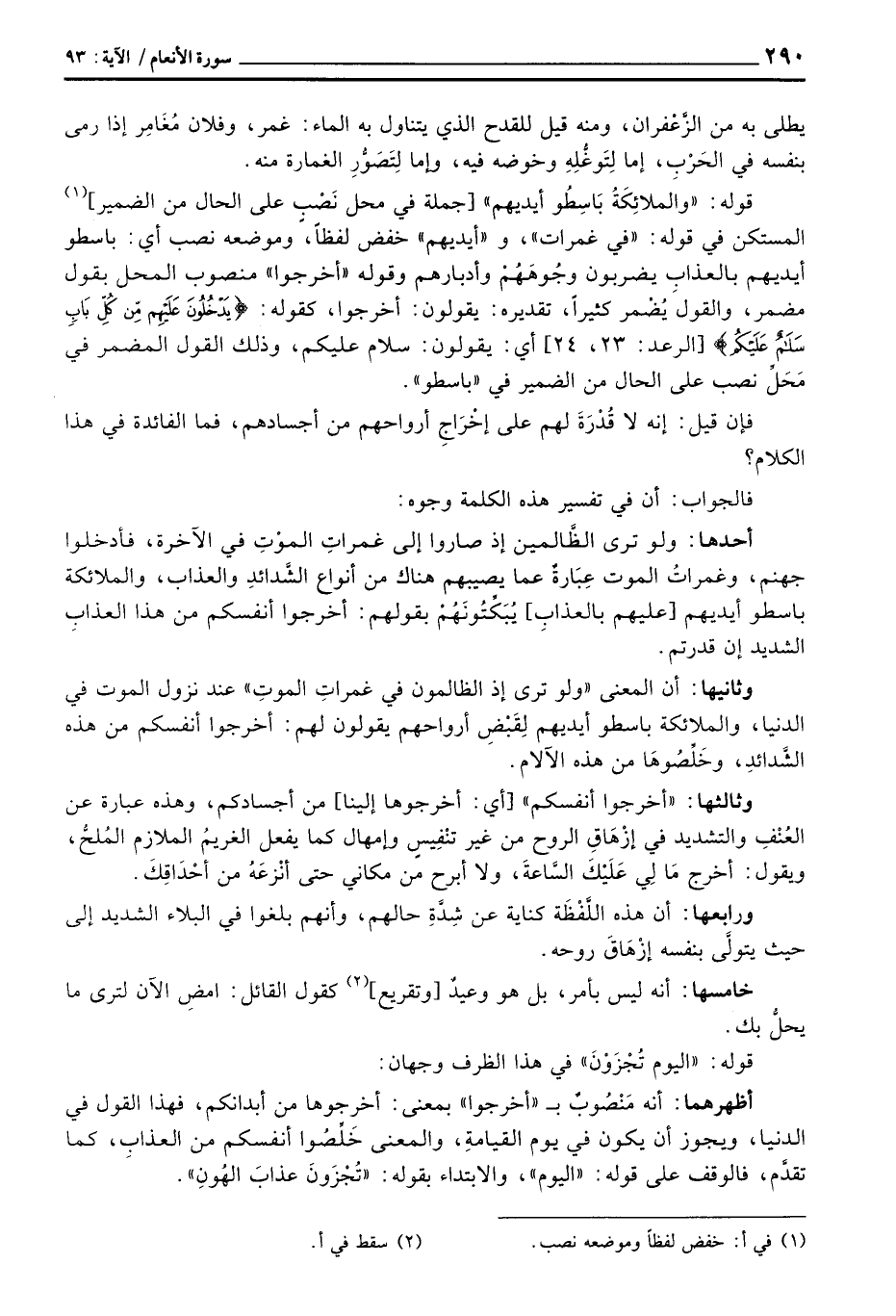 وثانيها: أن المعنى «ولو ترى إذ الظالمون في غمراتِ الموتِ» عند نزول الموت في الدنيا، والملائكة باسطو أيديهم لِقَبْضِ أرواحهم يقولون لهمك أخرجوا أنفسكم من هذه الشَّدائدِ، وخَلِّصُوهَا من هذه الآلام.