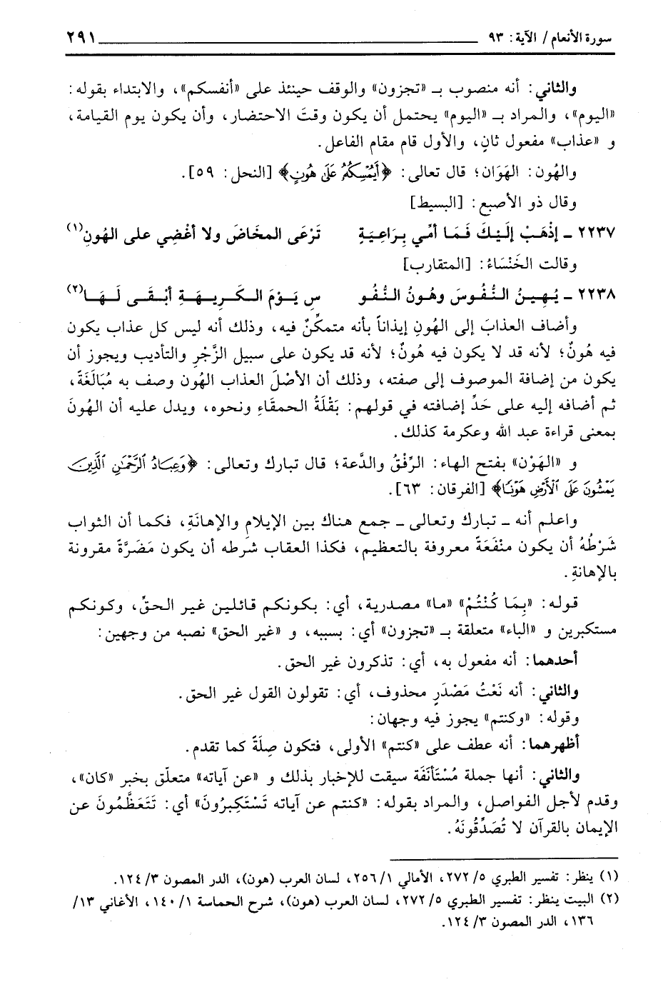 والثاني: أنه منصوب ب «تجزون» والوقف حينئذ على «أنفسكم» ، والابتداء بقوله: «اليوم» والمراد ب «اليوم» يحتمل أن يكون وقتَ الاحتضار، وأن يكون يوم القيامة، و «عذاب» معفول ثانٍ، والأول قام مقام الفاعل.