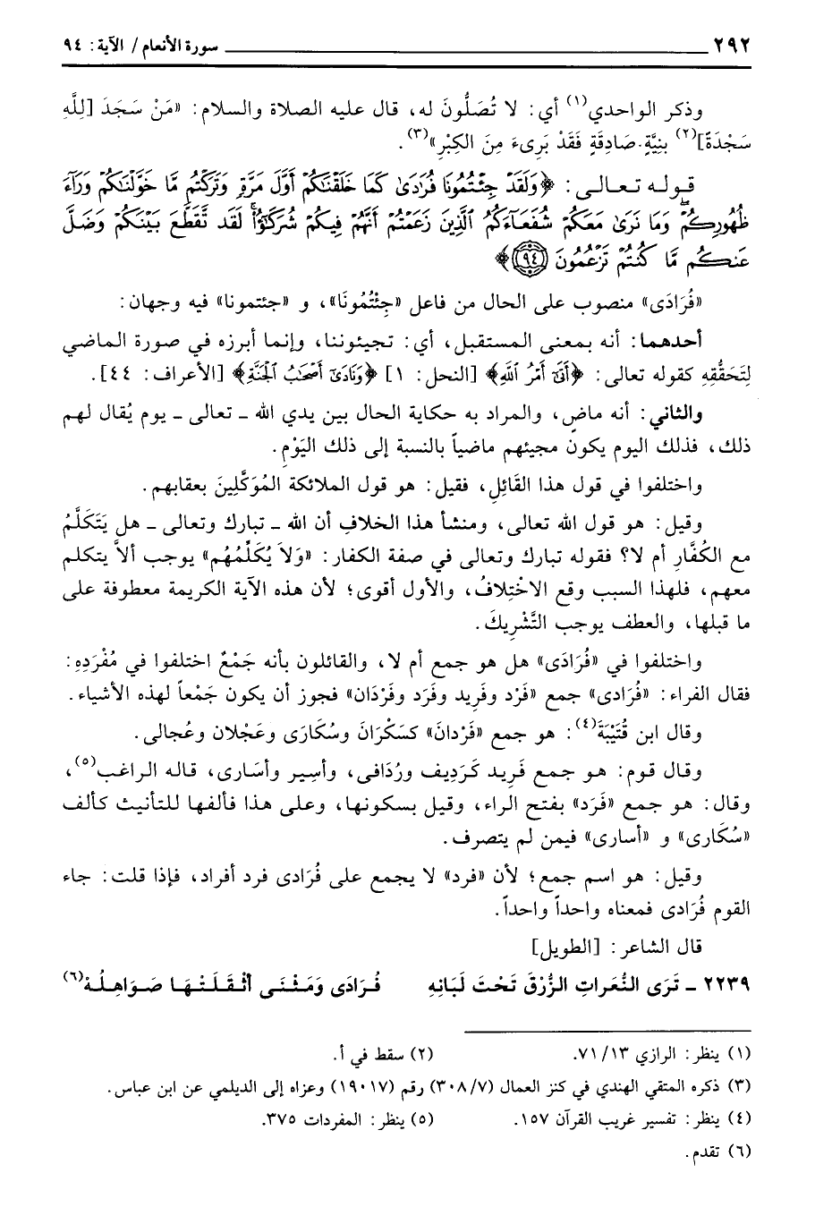 واختلفوا في «فُرَادَى» هل هو جمع أم لا، والقائلون بأنه جَمْعٌ اختلفوا في مُفْرَدِهِ: فقال الفراء: «فُرَادى» جمع «فَرْد وفَرِيد وفَرَد وفَرْدَان» فجوز أن يكون جَمْعاً لهذه الأشياء.
