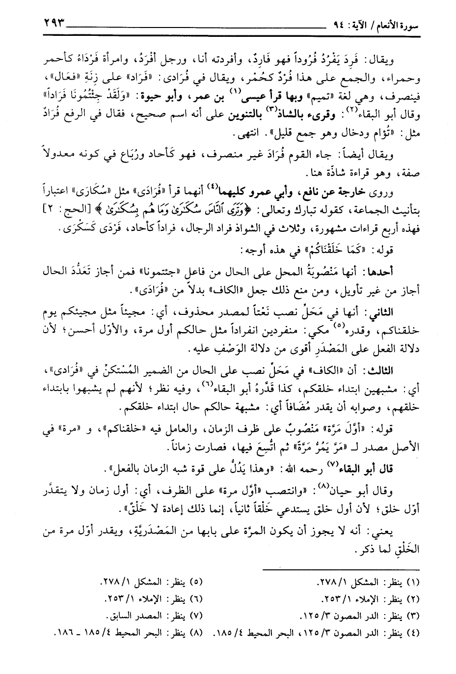 الثالث: أن «الكاف» في مَحَلِّ نصب على الحال من الضمير المُسْتكنِّ في «فُرَادى» ، أي: مشبهين ابتداء خلقكم، وكذا قَدَّرهُ أبو البقاء، وفيه نظر؛ لأنهم لم يشبهوا بابتداء خلقهم، وصوابه أن يقدر مُضَافاً أي: مشبهة حالكم حال ابتداء خلقكم.