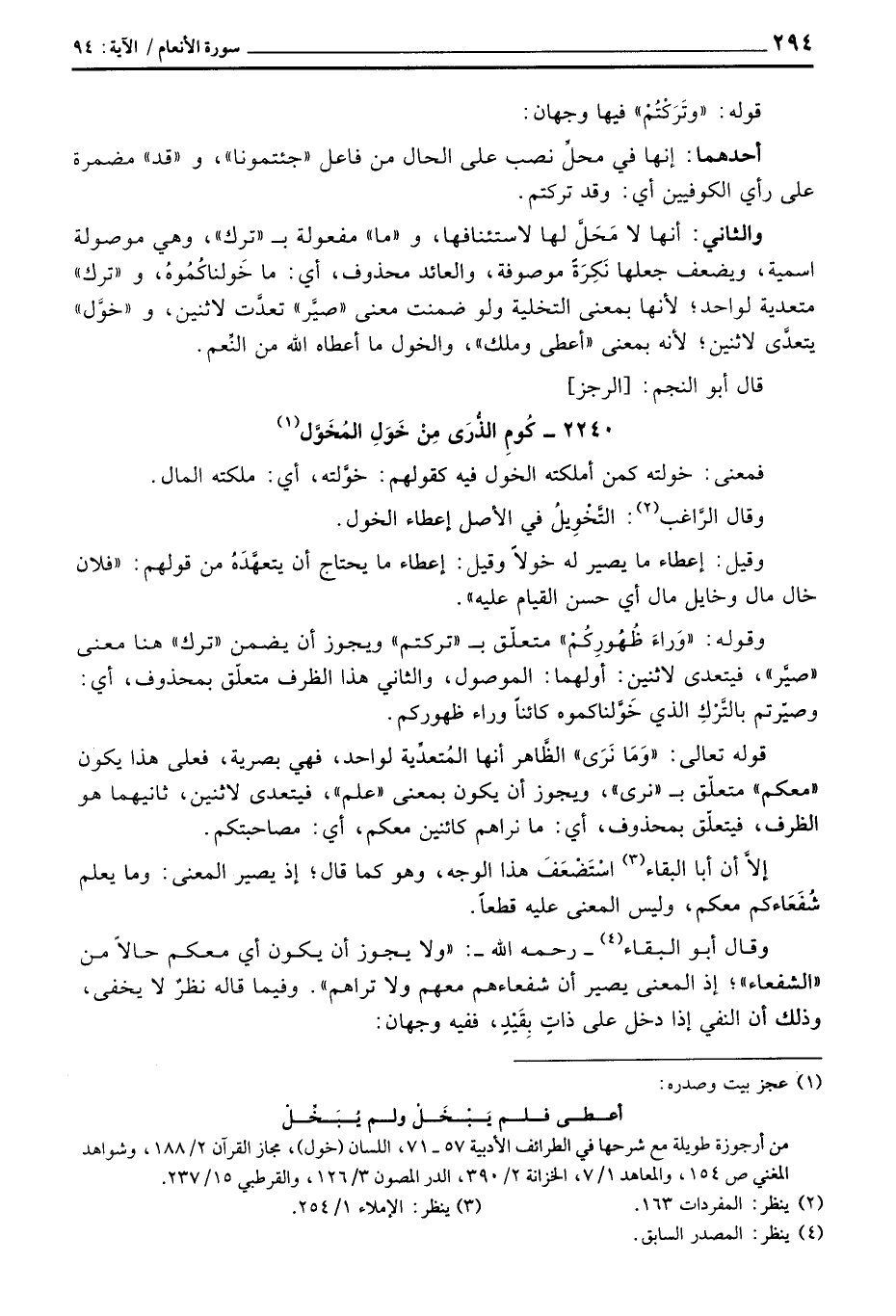 والثاني: أنها لا مَحَلَّ لها لاستئنافها، و «ما» مفعولة ب «ترك» ، وهي موصولة اسمية، ويضعف جعلها نَكِرَةً موصوفة، والعائد محذوف، أي: ما خَولناكُمُوهُ، و «ترك» متعدية لواحد؛ لأنها بمعنى التخلية ولو ضمنت معنى «صيَّر» تعدَّت لاثنين، و «خوَّل» يتعدَّى لاثنين؛ لأنه بمعنى «أعطى وملك» ، والخول ما أعطاه الله من النِّعم.