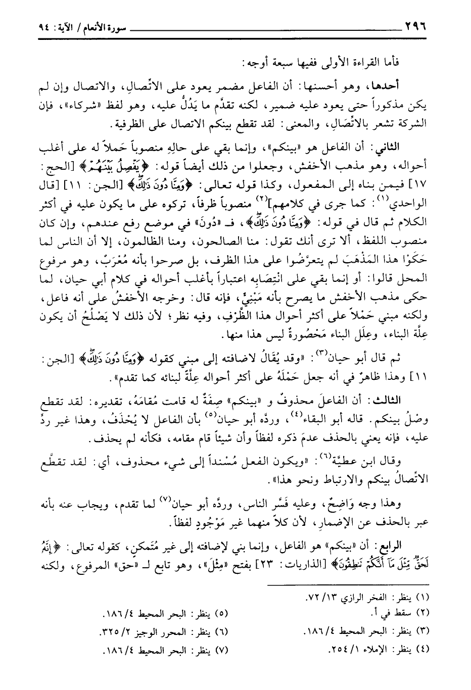 أحدها، وهي أحسنها: أن الفاعل مضمر يعود على الاتِّصالِ، والاتصال وإن لم يكن مذكوراً حتى يعود عليه ضمير، لكنه تقدم ما يَدُلُّ عليه، وهو لفظ» شركاء «، فإن الشركة تشعر بالاتِّصَالِ، والمعنى: لقد تقطع بينكم الاتصال على الظرفية.
