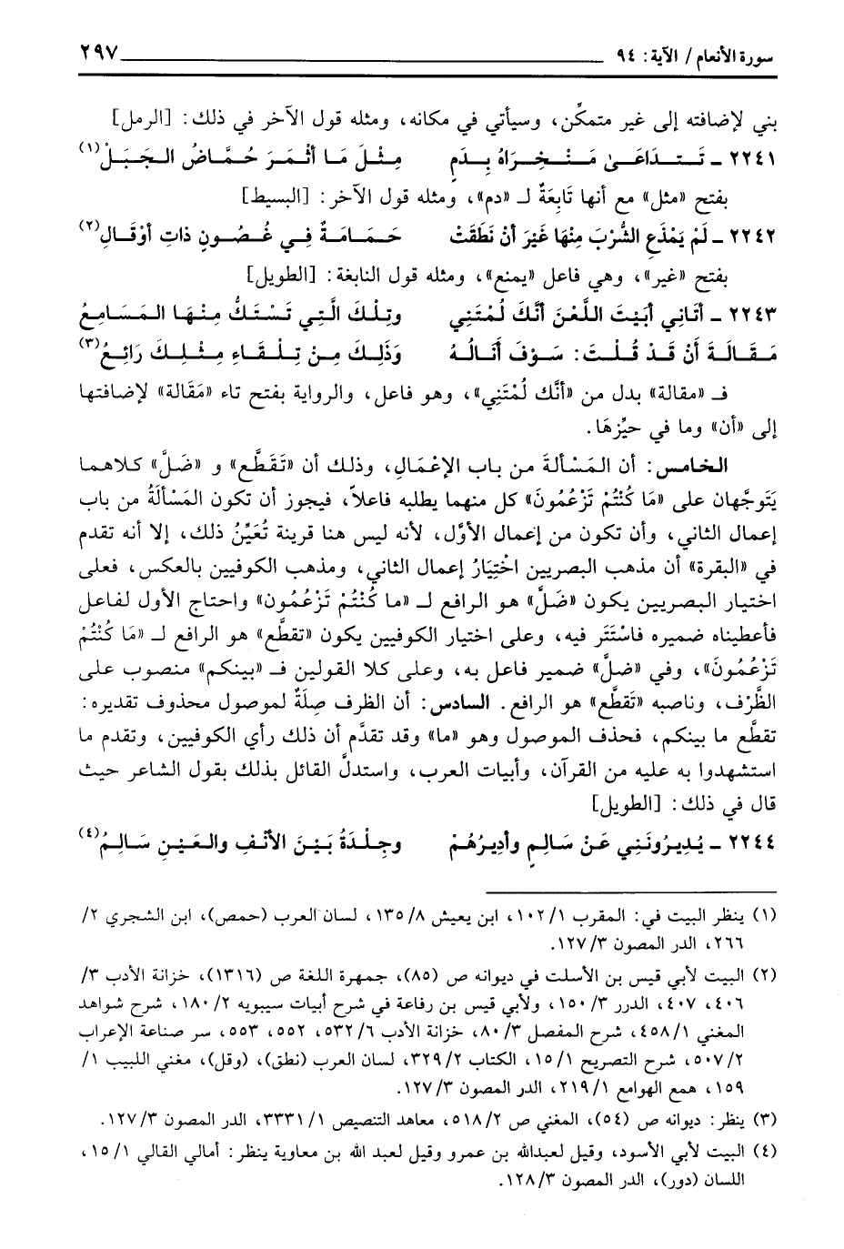الخامس: أن المَسْألةَ من باب الإعْمَالِ، وذلك أن «تَقَطَّع» و «ضَلَّ» كلاهما يَتَوجَّهلان على «مَا كُنْتُمْ تَزْعُمُونَ» كل منهما يطلبه فاعلاً، فيجوز أن تكون المَسْألَةُ من باب إعمال الثاني، وأن تكون من إعمال الأوَّل، لأنه ليس هنا قرينة تُعَيِّنُ ذلك، إلا أنه تقدم في «البقرة» أن مذهب البصريين اخْتِيَارُ إعمال الثاني، ومذهب الكوفيين بالعكس، فعلى اختيار البصريين يكون «ضَلَّ» هو الرافع ل «ما كُنْتُمْ تَزْعُمُون» واحتاج الأول لفاعل فأعطيناه ضميره فاسْتَتَر فيه، وعلى اختيار الكوفيين يكون «تقطَّع» هو الرافع ل «مَا كُنْتُمْ تَزْعُمُونَ» ، وفي «ضلَّ» ضمير فاعل به، وعلى كلا القولين ف «بينكم» منصوب على الظَّرْف، وناصبه «تَقطَّع» هو الرافع. السادس: أن الظرف صِلَةٌ لموصول محذوف تقديره: تقطَّع ما بينكن، فحذف الموصول وهو «ما» وقد تقدَّم أن ذلك رأى الكوفيين، وتقدم ما استشهدوا به عليه من القرآن، وأبيات العرب، واستتدلَّ القائل بذلك بقول الشاعر حيث قال في ذلك: [الطويل]