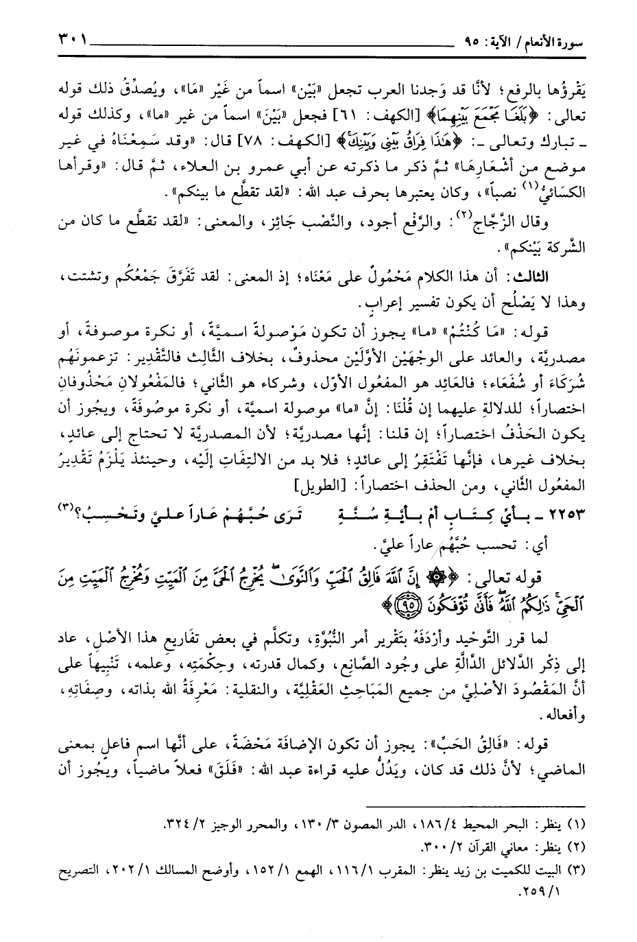 يَقْرؤُها بالرفع؛ لأنَّا قد وَجدنا العرب تجعل» بَيْنَ «اسماً من غَيْر» مَا «، ويُصدِّقُ ذلك قوله تعالى: {بَلَغَا مَجْمَعَ بَيْنِهِمَا} [الكهف: 61] فجعل» بَيْنَ «اسماً من غير» ما «، وكذلك قوله - تبارك وتعالى -: {هذا فِرَاقُ بَيْنِي وَبَيْنِكَ} [الكهف: 78] قال:» وقد سَمِعْنَاهُ في غير موضع من أشْعارِهَا «ثمَّ ذكر ما ذركته عن ابني عمرو بن العلاء، ثمَّ قال:» وقرأها الكسَائيُّ نصباً «وكان يعتبرها بحرف عبد الله:» لقد تقطَّع ما بينكم «.