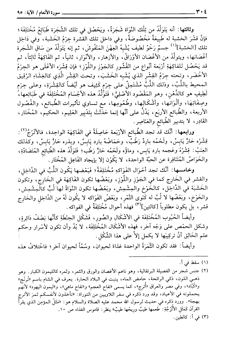 وخامسها: أنَّك تجد أحْوَال الفَوَاكهِ مُخْتَلِفَةً، فَبَعْضها يَكُون اللُّبُّ في الدَّاخلِ، والقشر في الخَارج كما في الجَوْزِ واللَّوزِ، وبَعْضُها تكون الفَاكِهَة في الخَارِجِ، وتكون الخَشَبَة في الدَّاخِل، كالخَوْخ والمِشْمِش، وبَعْضُها تكون النَّوَاةُ لها لُبُّ كالَمِشْمِش، والخَوْخ، وبَعْضُها لا لُبَّ له كَنَوى التَّمْرِ، وبَعْضُ الفَوَاكه لا يكُون لَهُ من الدَّاخلِ والخَارد قشر، بل يكون مطلوباً [كالتين] فهذه أحوال مُخْتَلِفَةٌ في الفواكه.