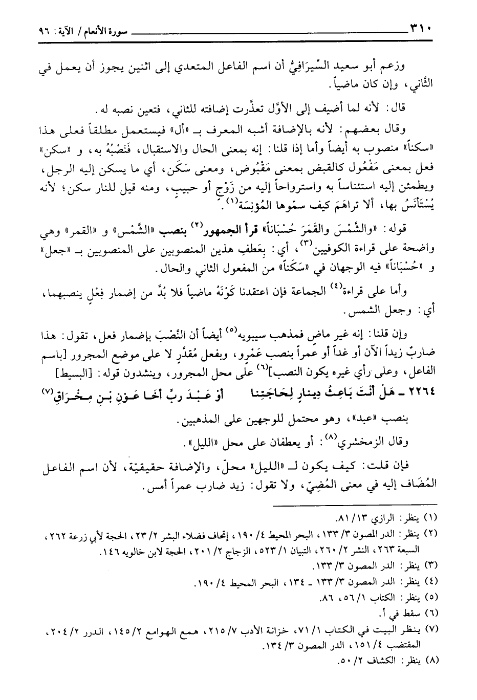 قوله: «والشَّمْسَ والقَمَرَ حُسْبَاناً» قرأ الجمهور بنصب «الشَّمس» والقمر «وهي واضحة على قراءة الكوفيين، أي: بِعَطفِ هذهين المنصوبين على المنصوبين ب» جعل «و» حُسْبَاناً «فيه الوجهان في» سَكَناً «من المفعول الثاني والحال.