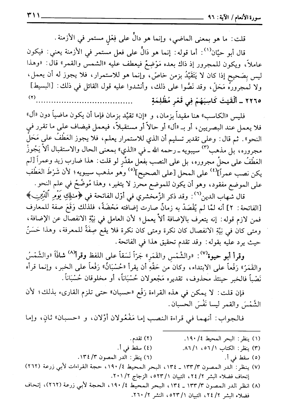 فإن قلت: لا يمكن في هذه القراءة رَفْع «حسبان» حتى تلزم القارئ بذلك، لأن الشَّمْسَ والقمر ليا نَفْسَ الحسبان.