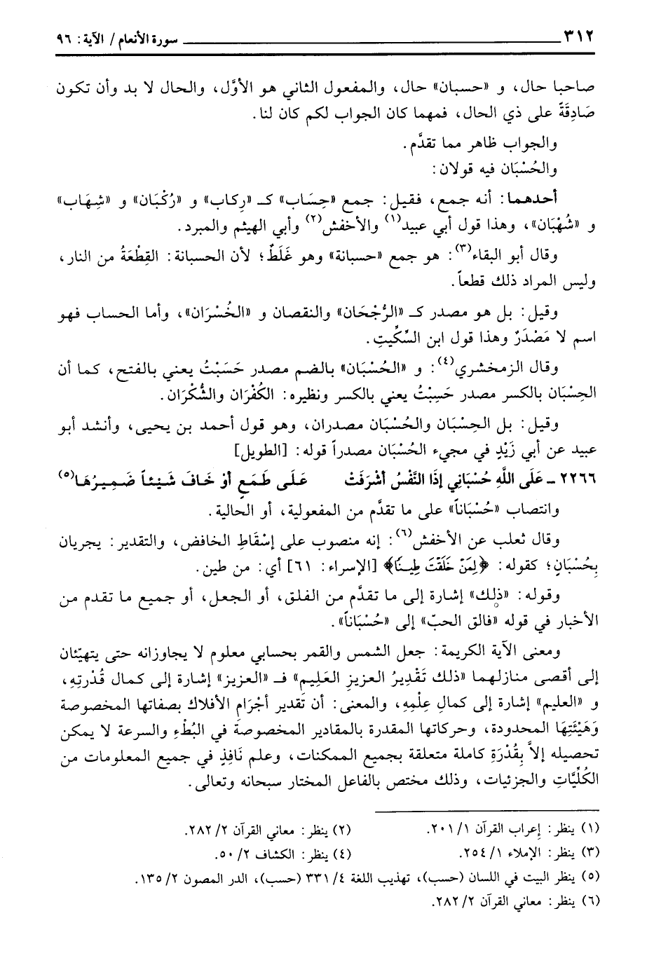 أحدهما: انه جمعن فقيل: جمع «حِسَاب» ك «رِكاب» و «رُكْبَان» و «شِهَاب» و «شُهْبَان» ، وهذا قول أبي عبيد والأخفش وأبي الهيثم والمبرد.